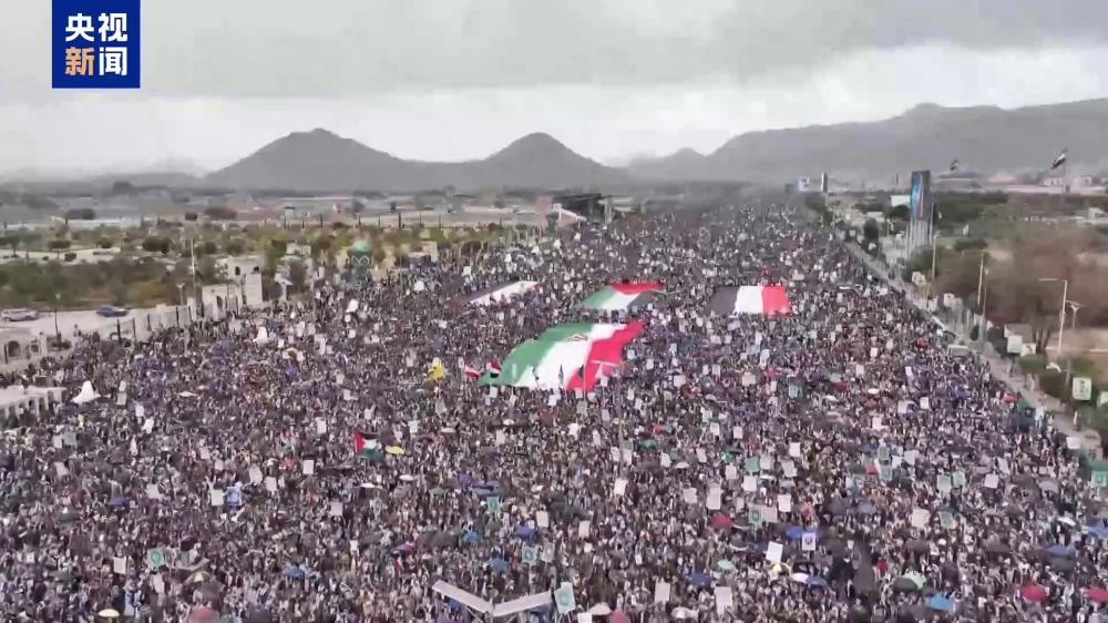 总台报道员 哈桑:随着地区军事紧张局势持续扩大,大批民众在也门首都萨那的七十广场举行集会,表达他们对于伊朗和黎巴嫩的声援。