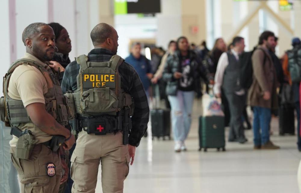3月23日,移民与海关执法局的执法人员在美国纽约拉瓜迪亚机场的出发安检处执勤。新华社记者张凤国摄
