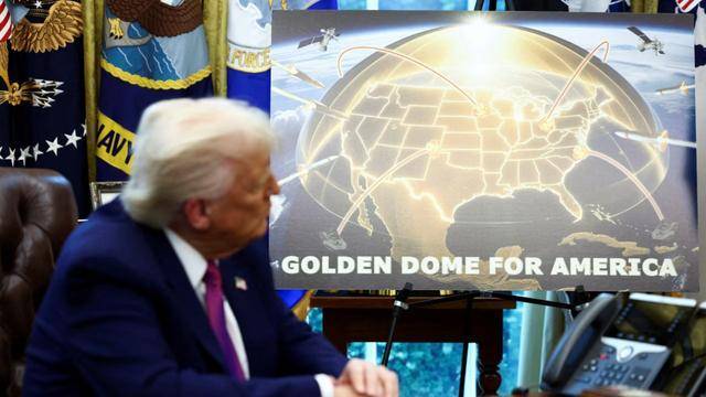 2025年5月,特朗普在白宫展示“金穹”的导弹防御计划的概念图。