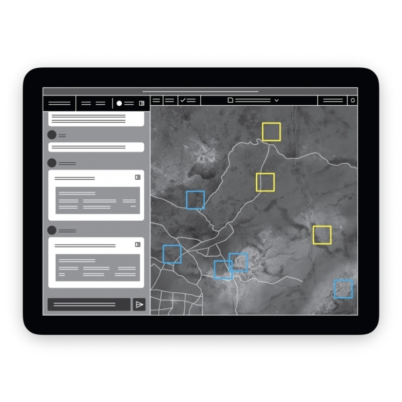 Maven 智能态势感知界面示意图:AI 自动标注潜在目标(黄)与受保护区域(蓝),辅助指挥官在高度不确定环境下快速做出关键决策。