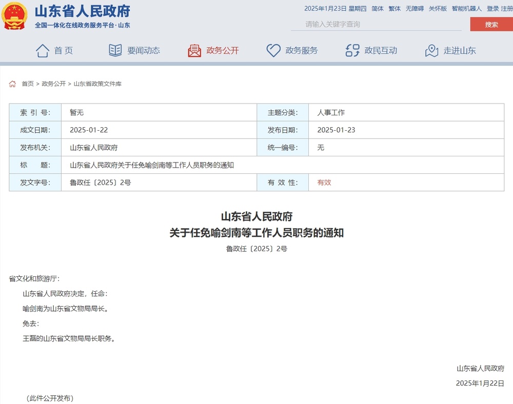 1月22日,山东省人民政府网站发布通知:山东省人民政府决定任命喻剑南为山东省文物局局长。