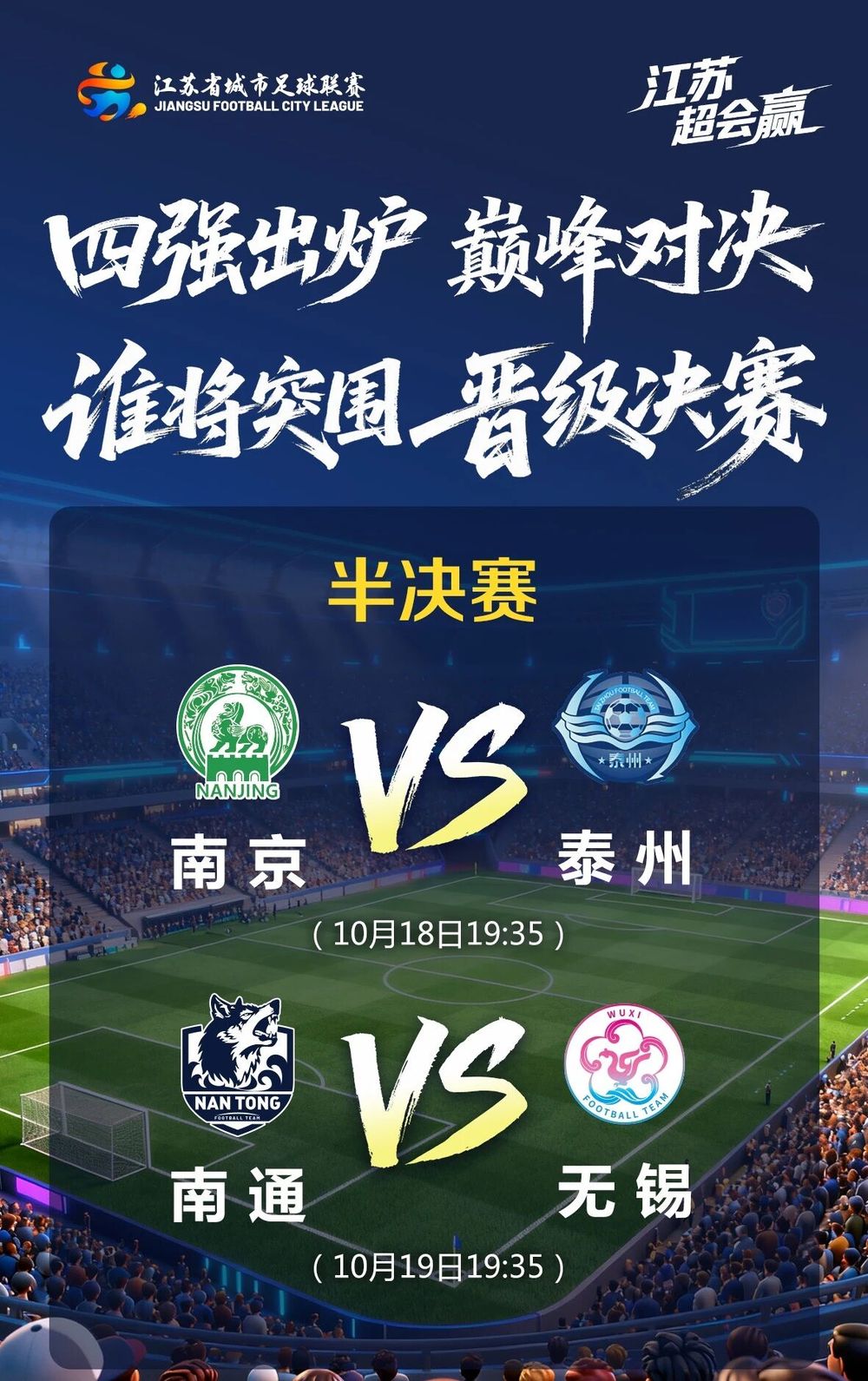 “苏超”半决赛将于18日、19日进行,南通与无锡、南京与泰州争夺决赛资格。