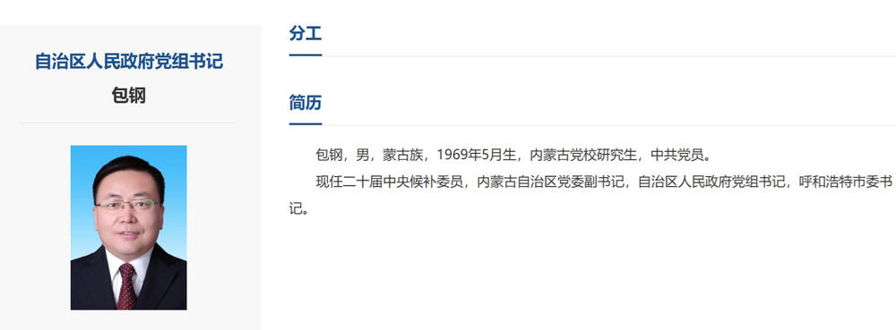 内蒙古自治区政府网站“政府领导”一栏最新信息显示,包钢现任内蒙古自治区党委副书记,自治区人民政府党组书记,呼和浩特市委书记。
