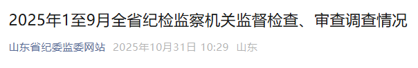 10月31日,山东省纪委监委网站发布2025年1至9月全省纪检监察机关监督检查、审查调查情况,详情如下: