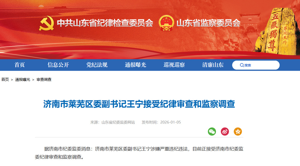据济南市纪委监委消息:济南市莱芜区委副书记王宁涉嫌严重违纪违法,目前正接受济南市纪委监委纪律审查和监察调查。