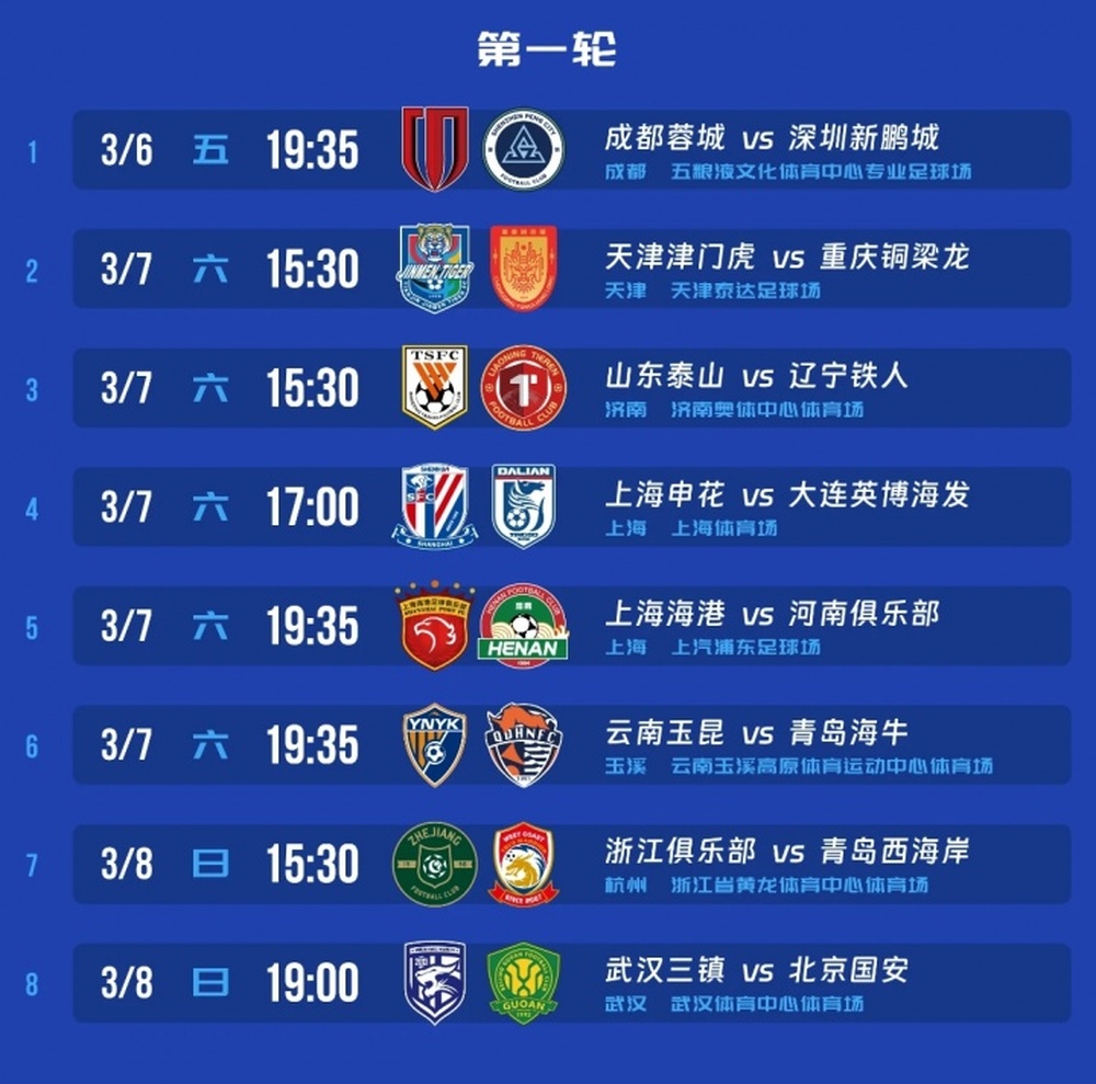新赛季中超首轮赛程