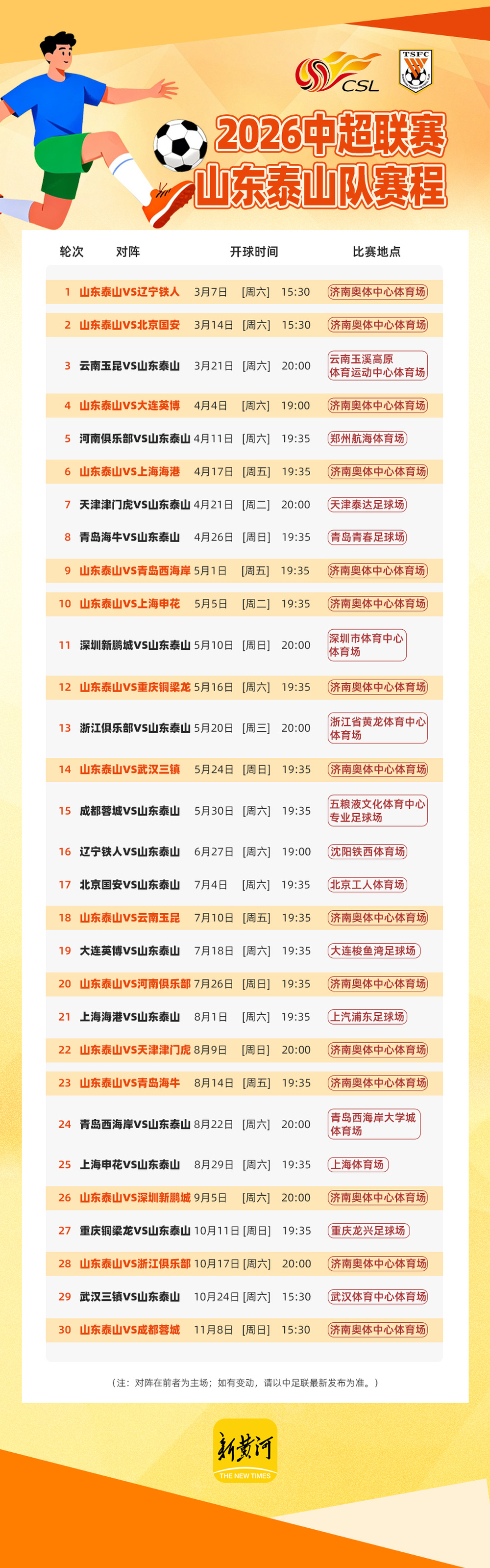 泰山队在3月份要经历“两主一客”的赛程,分别是3月7日主场揭幕战对阵辽宁铁人,3月14日主场对阵北京国安,3月21日客战云南玉昆。