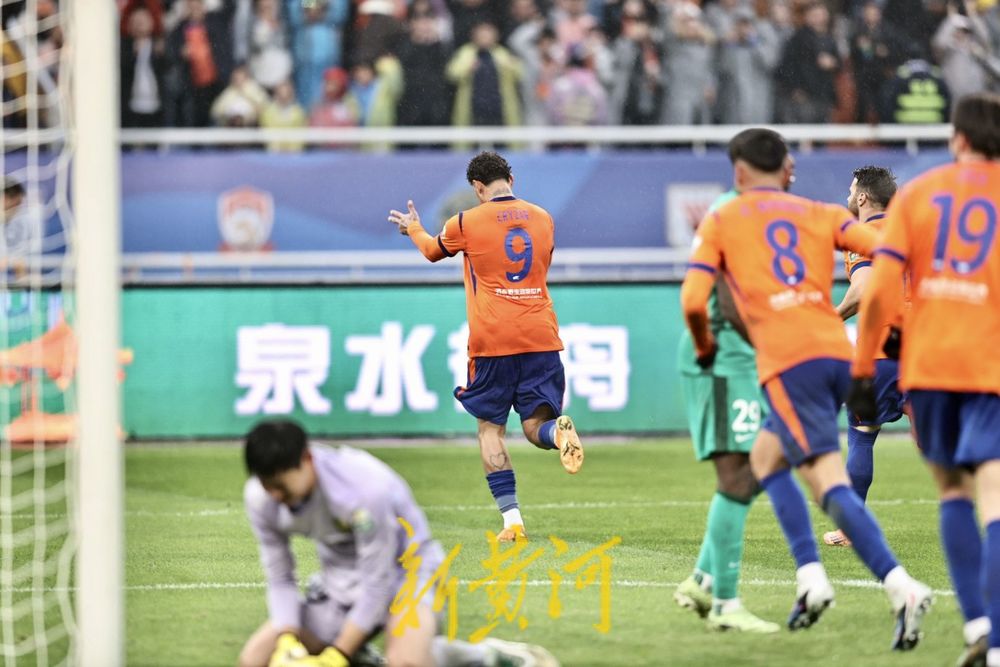 此后,两队陷入鏖战。第86分钟,北京国安恩科洛洛边路下底传中,张玉宁门前抢点得手,两队战成1:1。就在比赛朝着平局的结果推进之时,克雷桑站了出来。第88分钟,李源一主罚定位球,克雷桑头球攻门得手,泰山队2:1锁定胜局。