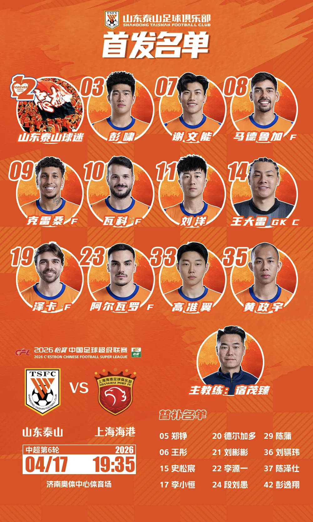 北京时间4月17日19:35,中超第6轮,山东泰山队主场对阵上海海港,赛前双方首发阵容公布。