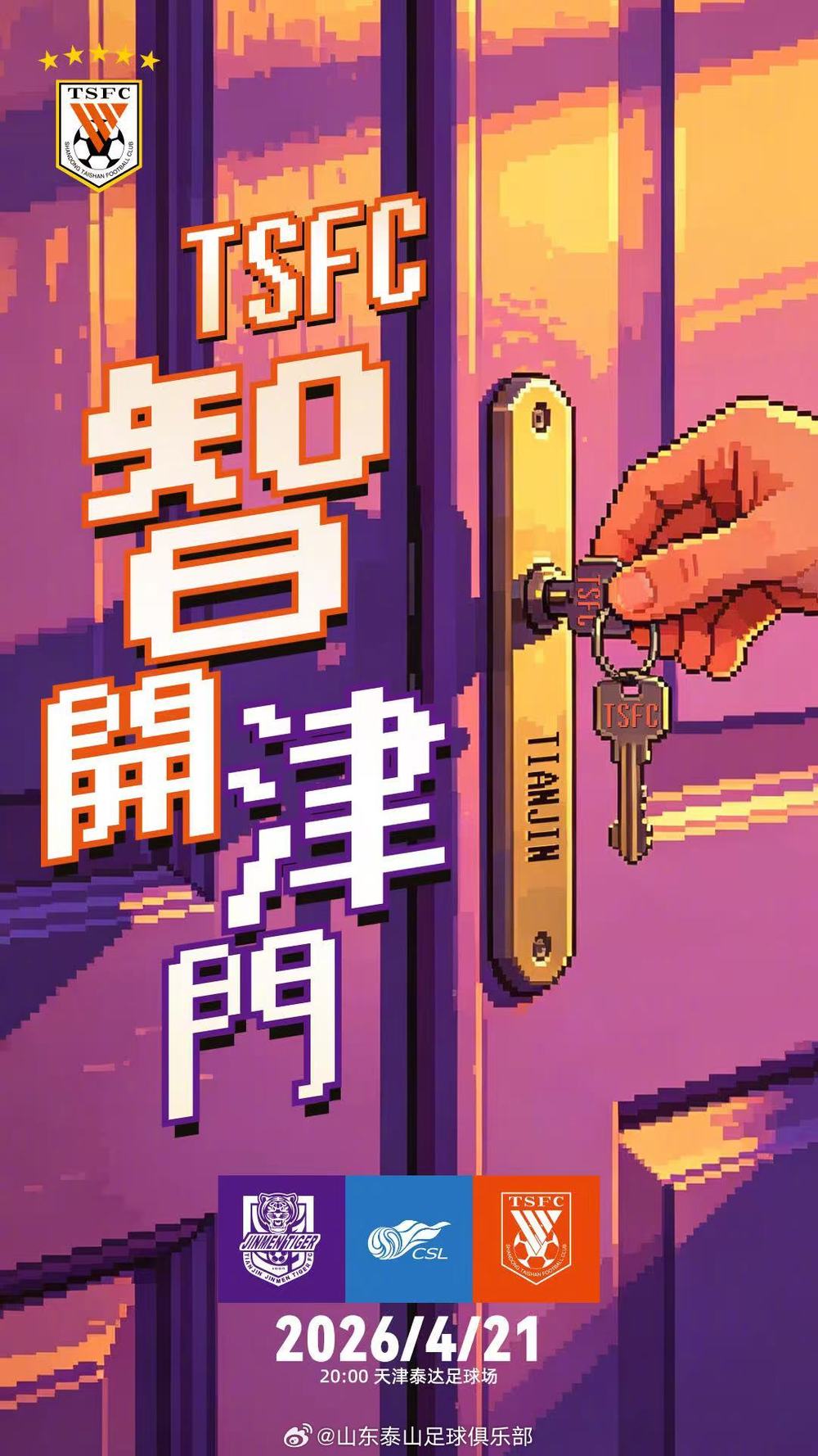 “智开津门!”客战天津津门虎赛前,山东泰山队官方发布了以此为主题的预热海报。海报中,一把标有泰山队标识的钥匙,即将开启一扇有天津队标识的门。对泰山队将帅来说,若想在客场取得理想的结果,或许真的需要像这张创意十足的海报所描述的那样——“智取”为上。