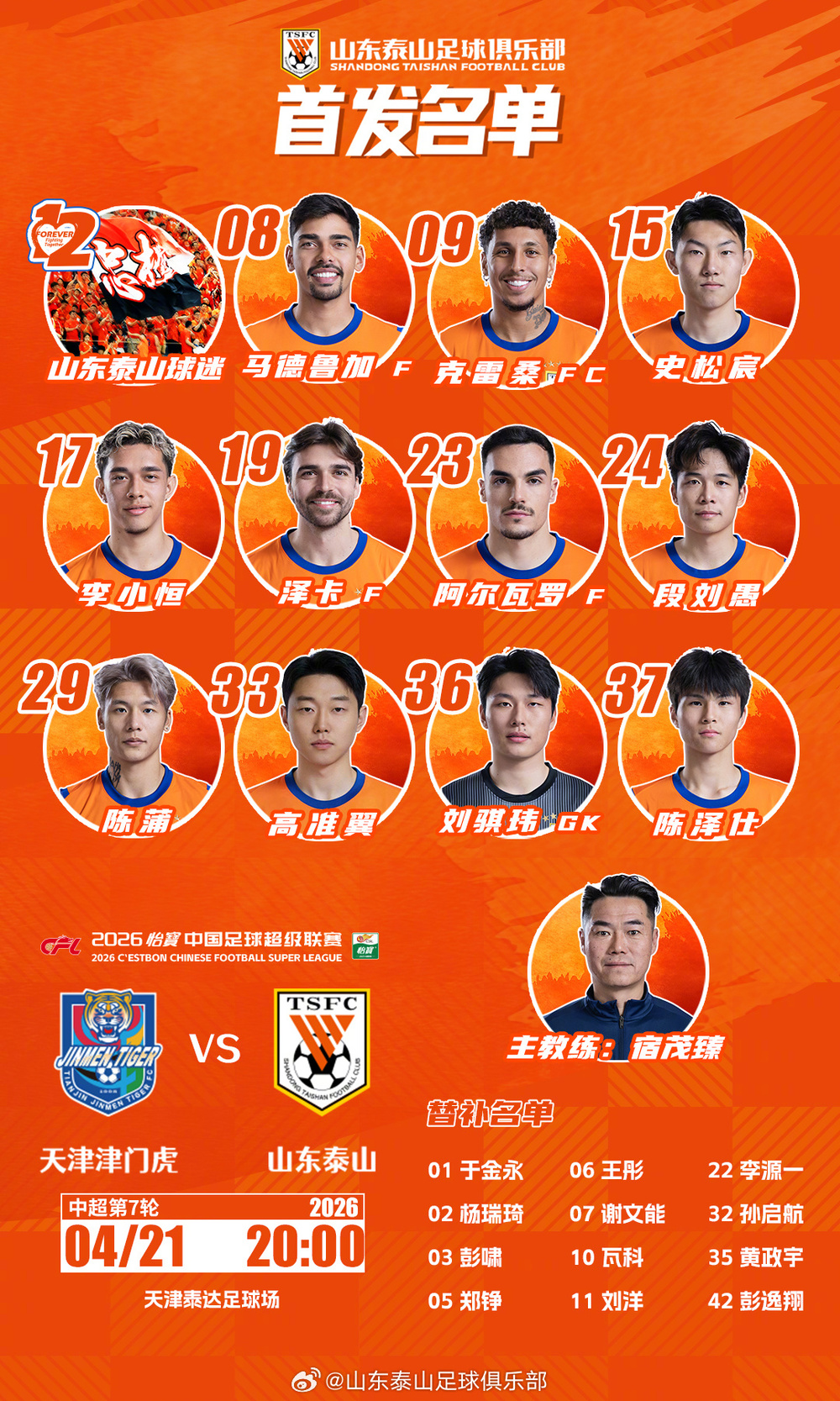 山东泰山替补:1-于金永、32-孙启航、2-杨瑞琦、3-彭啸、5-郑铮、6-王彤、11-刘洋、35-黄政宇、7-谢文能、22-李源一、10-瓦科(F)、42-彭逸翔