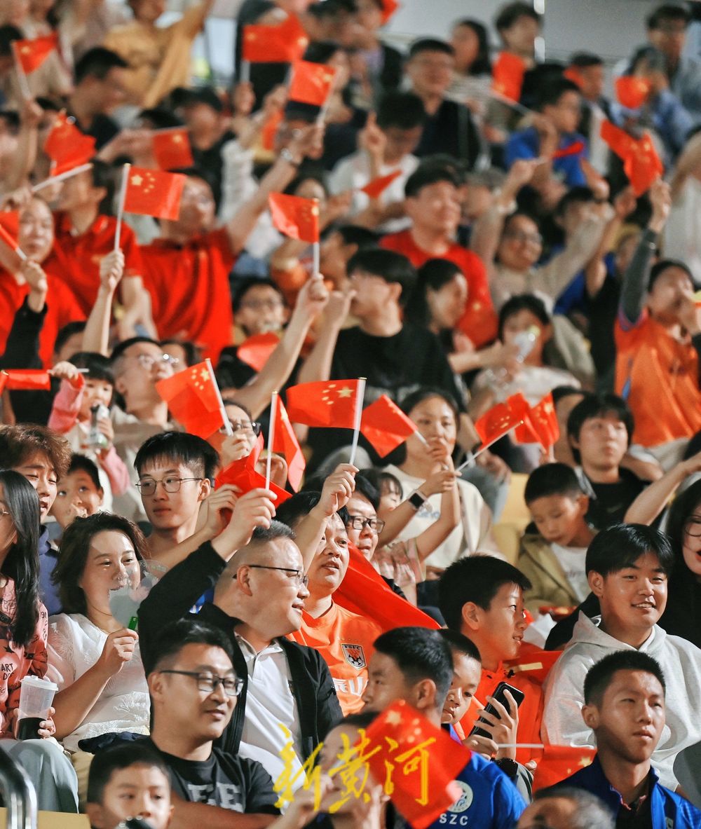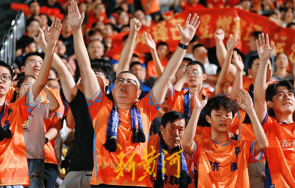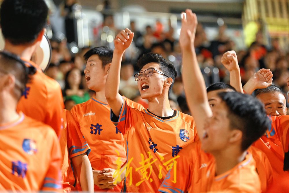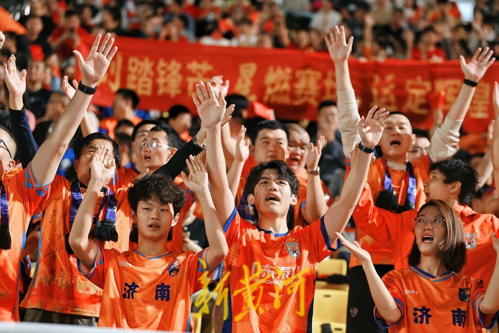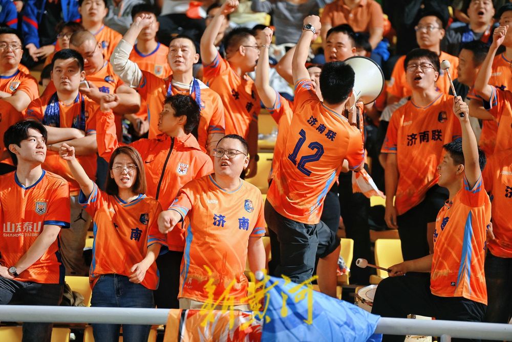 比赛现场,济南联队球迷挥舞着手中的国旗,在看台上高唱战歌,为自己的主队呐喊助威,场面令人动容。