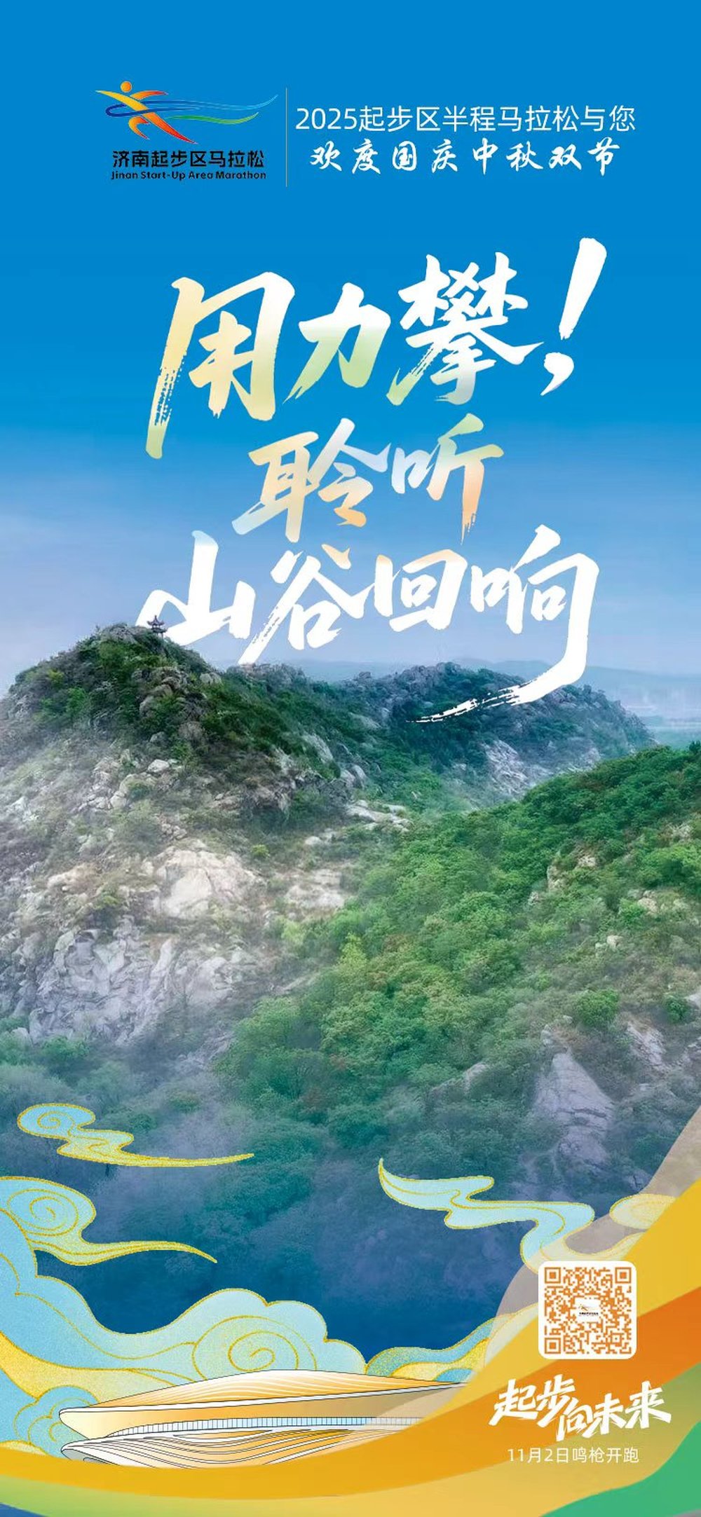 国庆中秋假期来临,2025济南起步区半程马拉松与您同庆双节。前路曲折,也要用力攀登,一路向上方可听见山谷回响。