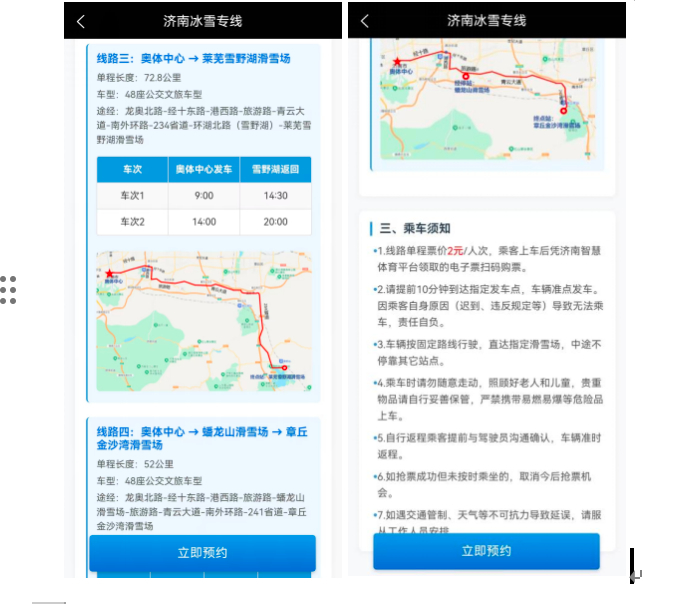 3.本页为济南冰雪专线页面,清晰展示了专车预约规则,以及线路信息展示,点击立即预约。