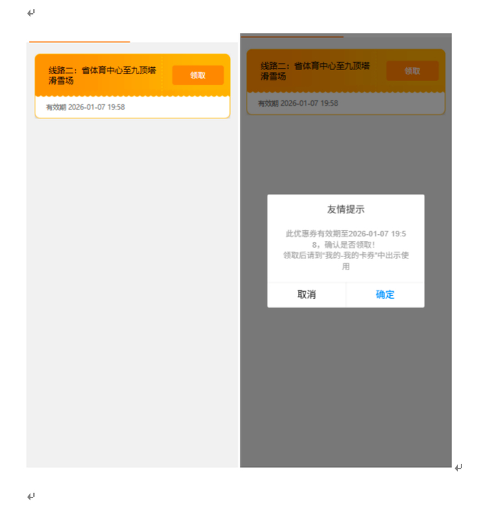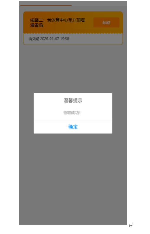 4.进入卡券领取页面,选择需要的线路点击“领取”弹出友情提示,点击确定,领取成功。