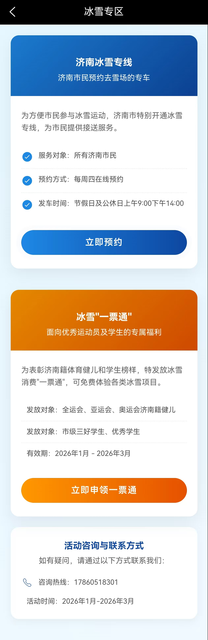 2.进入冰雪专区,点击济南冰雪专线板块的“立即预约”按钮。