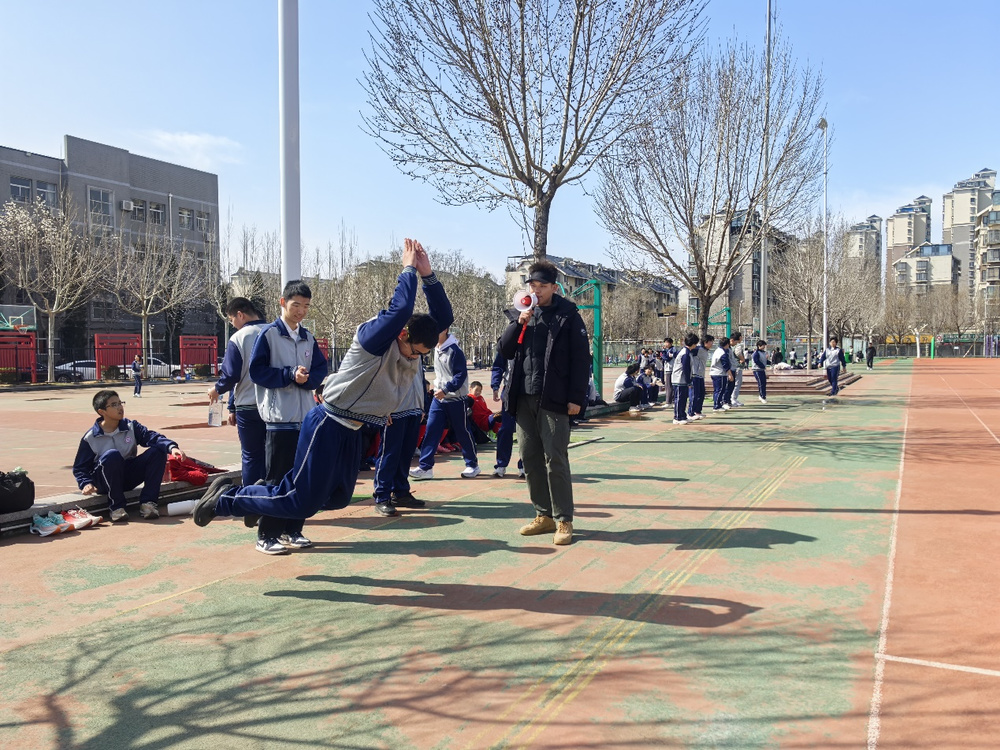 立定跳远教学中,教练严格对标中考体育评分标准,将动作科学拆解为预摆、起跳、腾空、落地四个环节进行精细化教学:从预摆时双脚与肩同宽、双臂自然摆动蓄力,到起跳瞬间双脚迅猛蹬地、双臂向前上方摆动带动身体充分伸展;从腾空时收腹举腿、大腿向胸前靠拢,到落地时小腿前伸、脚跟先着地并迅速屈膝缓冲。教练不仅以专业的运动知识解析每个环节的发力原理,更运用生动形象的比喻和幽默风趣的语言点燃学生热情。原本紧张的学生在轻松氛围中迅速掌握动作要领,训练场上笑声不断,孩子们在欢乐中真切体验到运动的乐趣。