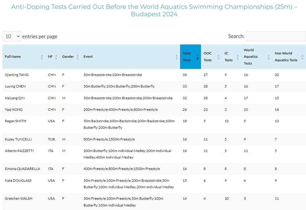 世界泳联公布2024布达佩斯短池游泳世锦赛参赛选手的兴奋剂检测次数(2024年1月1日至12月4日),前四全是中国选手。