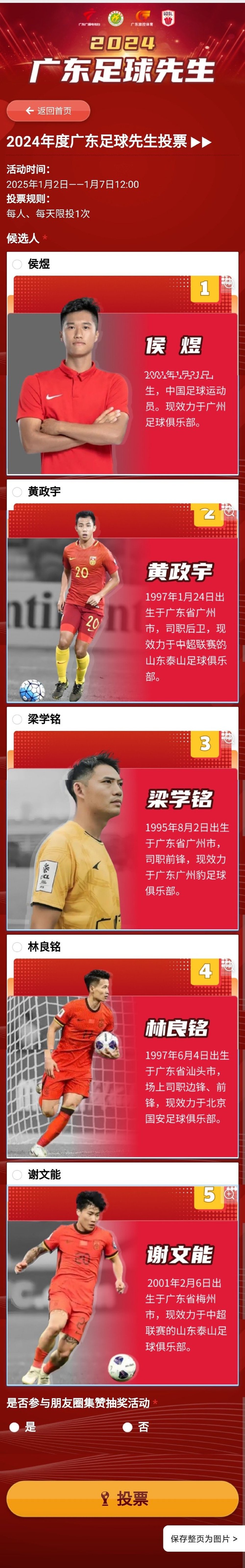 近日,广东省足协公布了2024年度广东足球先生和足球小姐候选名单,侯煜、黄政宇、梁学铭、林良铭、谢文能入围足球先生候选名单,陈巧珠、李晴潼、罗桂平、袁丛、张子媚入围足球小姐候选。