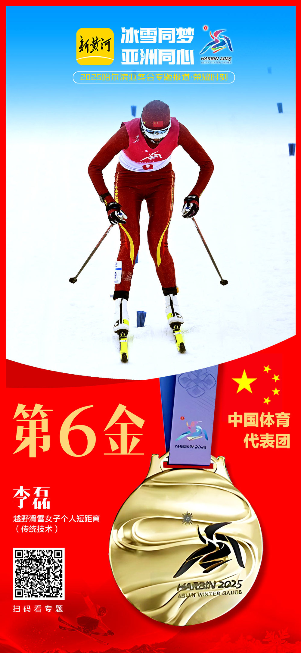 哈尔滨亚冬会越野滑雪女子个人短距离(传统技术)决赛中,中国队选手李磊获得金牌。 这是中国队获得的第六金,也是中国队亚冬会历史第100金!