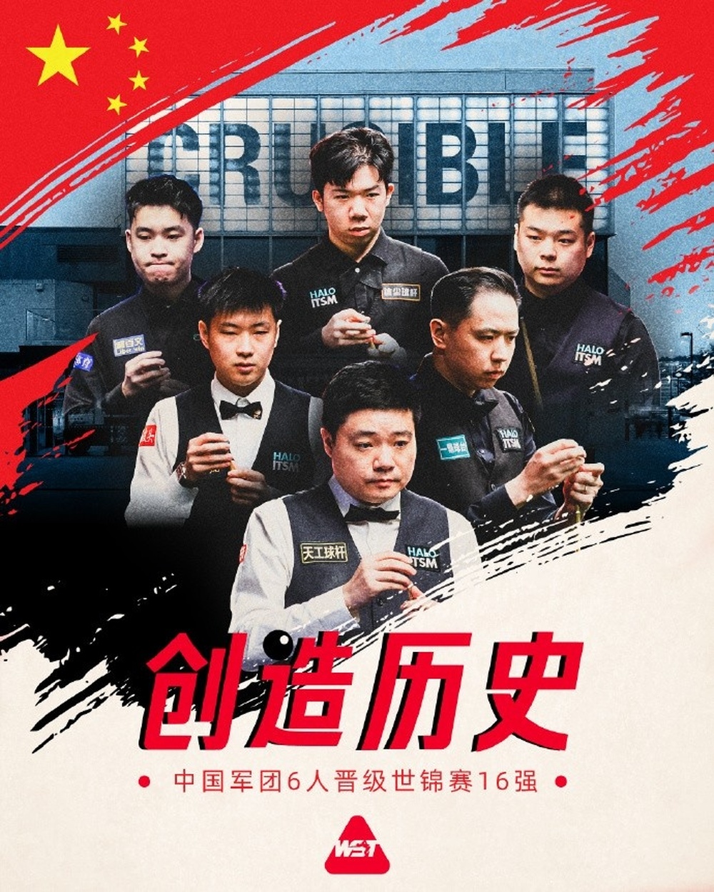 世界斯诺克巡回赛官方为海报配文写道:“他们,是历史的缔造者!??中国军团晋级2025斯诺克世锦赛16强创造历史!”