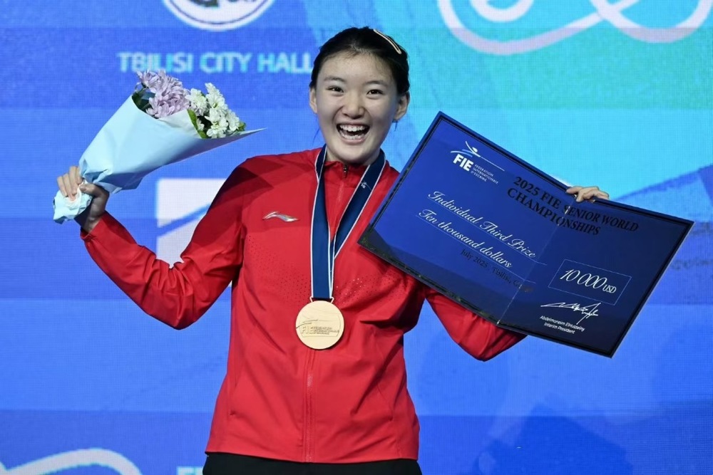 据中国击剑协会消息,2025年第比利斯世界击剑锦标赛于当地时间7月27日继续进行。中国队16岁小将潘其妙在女子佩剑个人赛中摘得铜牌。