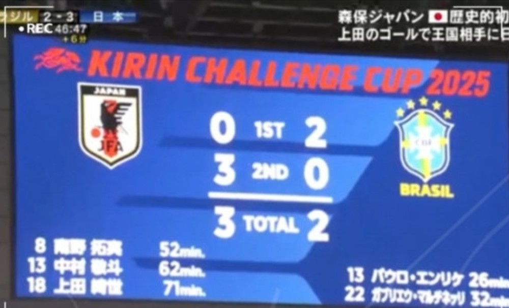 10月14日晚进行的一场热身赛中,日本男足主场3比2战胜来访的巴西队。在一度两球落后的情况下,日本队连追三球,以3比2的比分战胜巴西队。