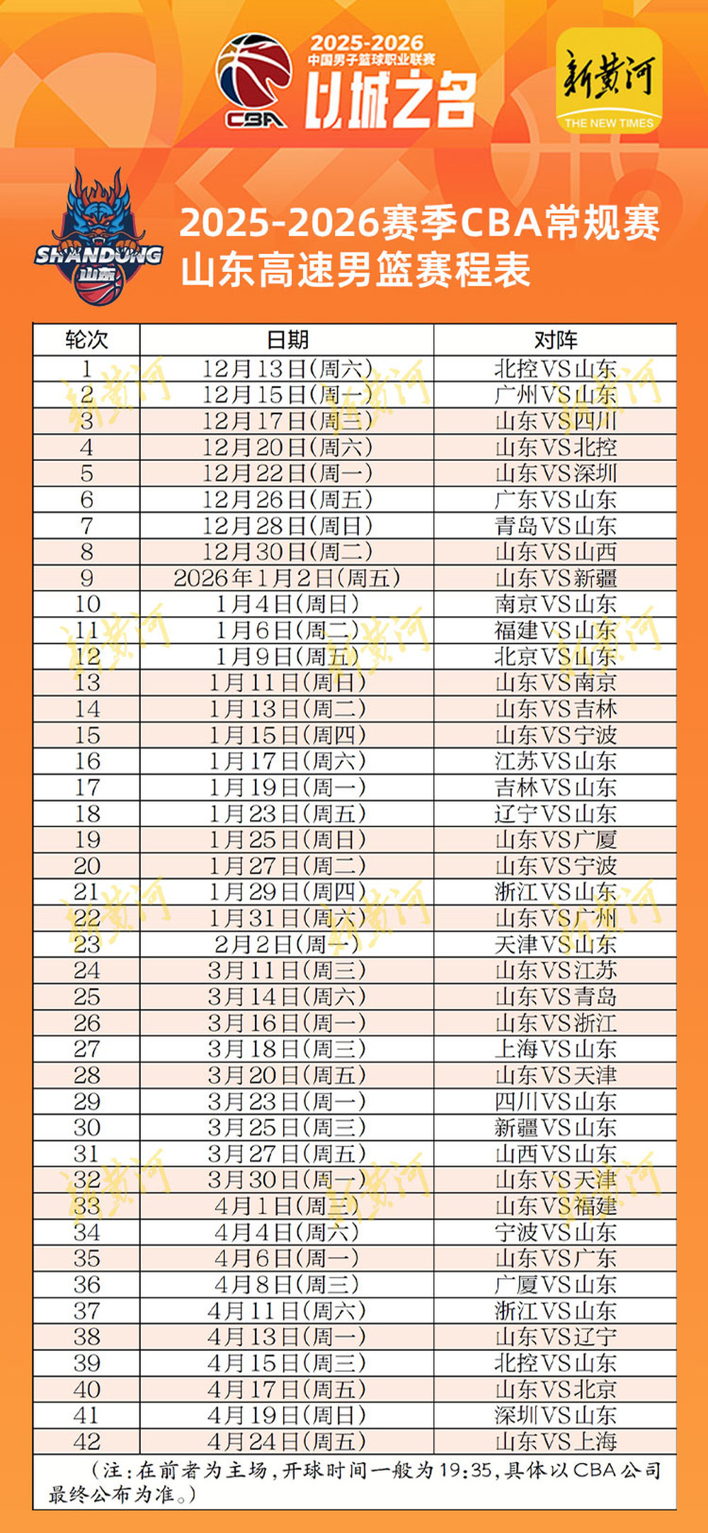 2025-2026赛季CBA联赛常规赛将于12月12日开赛,2026年4月24日收官。和上赛季相比,2025-2026赛季CBA常规赛赛程减少了4轮,共有42轮比赛。常规赛阶段,20支球队被分为四组,每队与同组内其他球队各进行3场比赛(2主1客或2客1主),与不同组球队各进行2场比赛(1主1客)。山东高速男篮同组球队有浙江广厦、北控、天津队、宁波队。按照竞赛规程,山东高速男篮对阵同组的广厦和北控时均为2客1主,对阵天津队和宁波队则都是2主1客。新赛季山东高速男篮共有21个主场比赛,和上赛季一样,前8个主场设在临沂奥体公园体育馆,此后的13个主场设在济南的山东高速篮球馆。具体赛程如下:
