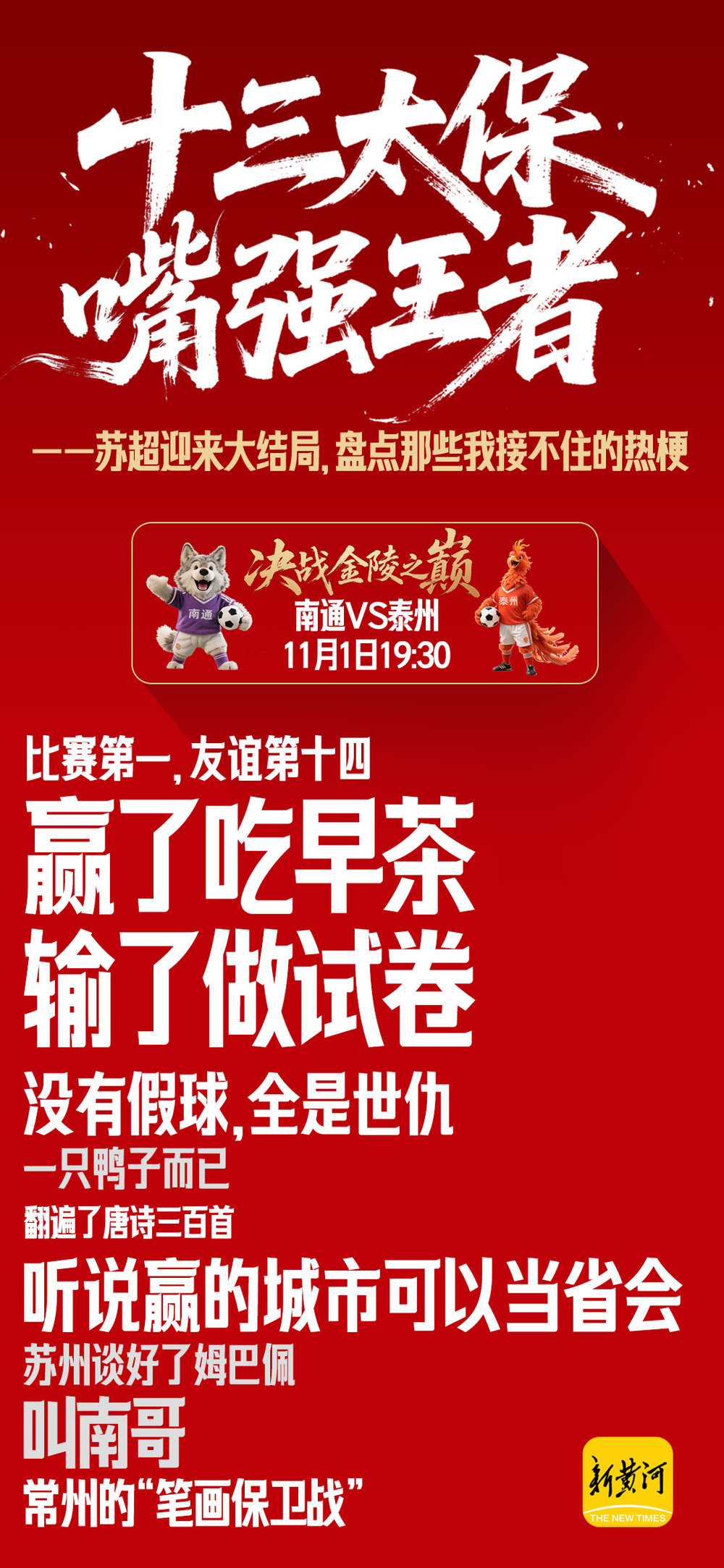 11月1日晚,2025年江苏省城市足球联赛(简称苏超)决赛将在南京奥体中心体育场打响。常规赛“领头羊”南通队与“最大黑马”泰州队将争夺首届苏超的冠军。