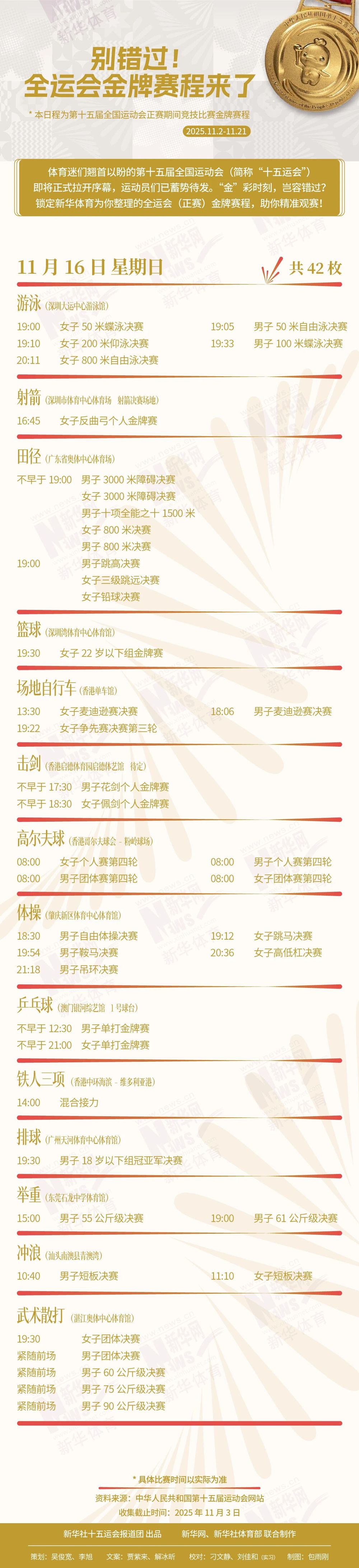 +订阅体育迷们翘首以盼的第十五届全国运动会(简称“十五运会”)即将正式拉开序幕,运动员们已蓄势待发。“金”彩时刻,岂容错过?锁定新华体育为你整理的全运会(正赛)金牌赛程,助你精准观赛!