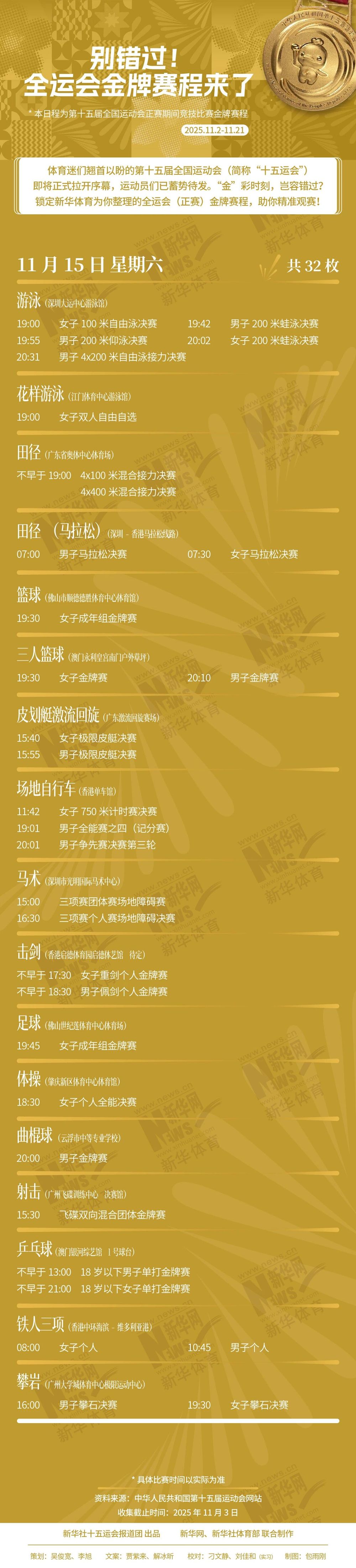 体育迷们翘首以盼的第十五届全国运动会(简称“十五运会”)即将正式拉开序幕,运动员们已蓄势待发。“金”彩时刻,岂容错过?锁定新华体育为你整理的全运会(正赛)金牌赛程,助你精准观赛!
