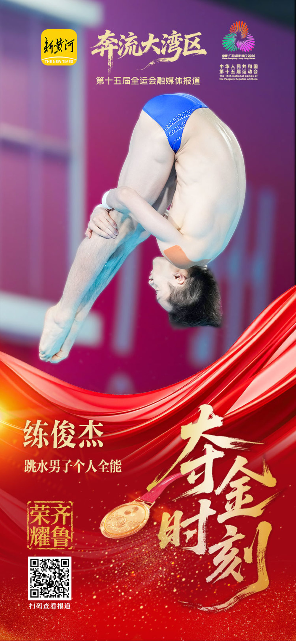 11月5日,在第十五届全国运动会跳水男子个人全能决赛中,练俊杰以总分1005.10分夺得冠军,为山东代表团再添一金。