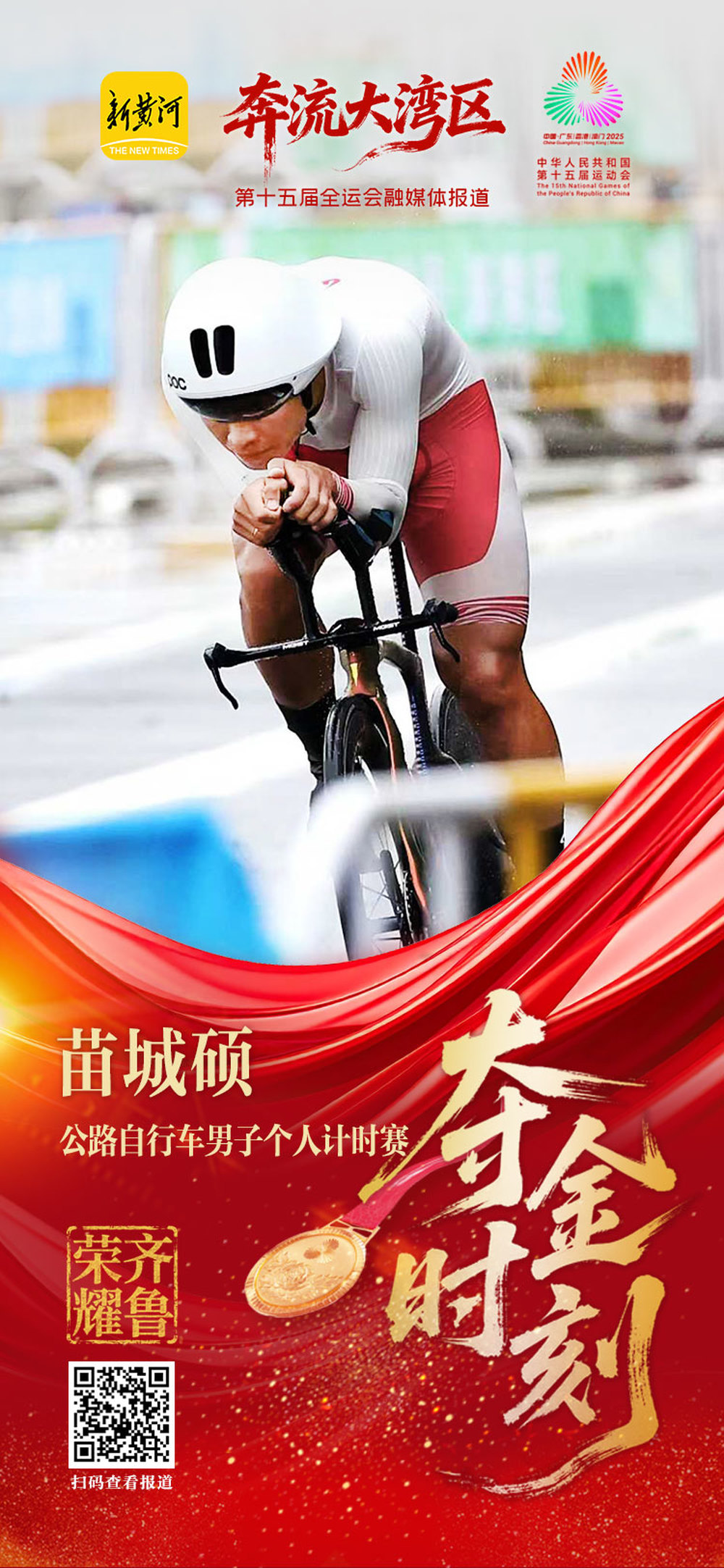 11月7日上午,第十五届全运会公路自行车男子个人计时赛举行,山东选手苗城硕在激烈角逐中胜出,夺得金牌。另一名山东运动员曹厚旺摘得铜牌。