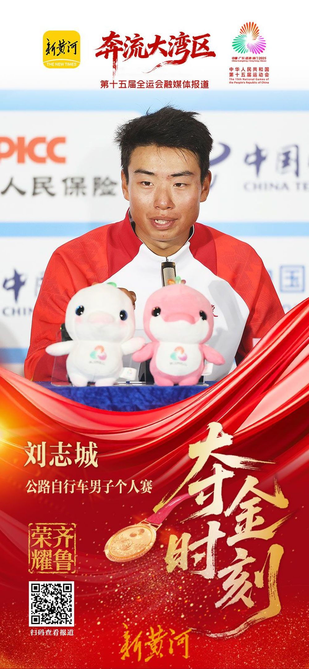 11月8日,在第十五届全国运动会跨境赛事——公路自行车男子个人赛中,山东选手刘志城率先撞线,夺得金牌。