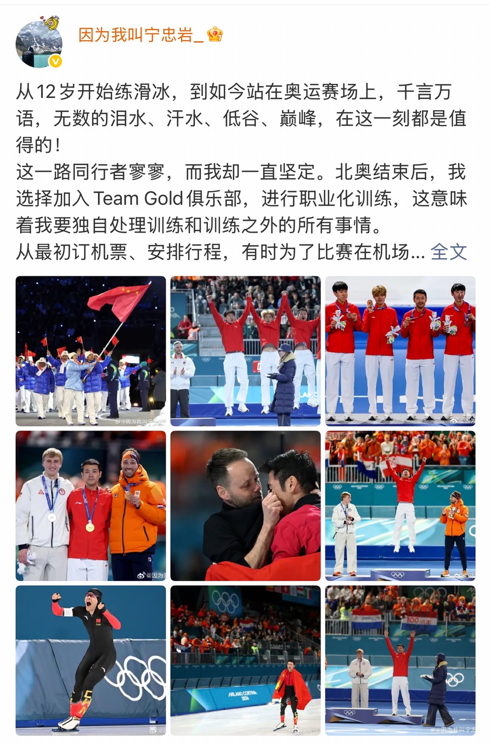 “从12岁开始练滑冰,到如今站在奥运赛场上,千言万语,无数的泪水、汗水、低谷、巅峰,在这一刻都是值得的!这一路同行者寥寥,而我却一直坚定。北奥结束后,我选择加入Team Gold俱乐部,进行职业化训练,这意味着我要独自处理训练和训练之外的所有事情。从最初订机票、安排行程,有时为了比赛在机场过夜,到今天成为了金牌选手,这一路我不敢往回想,直到此刻我依旧不敢相信自己真的获得了金牌。当今世界速滑赛场,用大家常说的话来形容,那真是太卷了!金牌、不可思议!而我,真的做到了!春节期间,为大家送上一份礼物,这份礼物用我的汗水和坚持获得,我想一定带着满满的真诚和祝福。14天前的开幕式,当我手持国旗入场时,便下定决心全力以赴、不留遗憾。现在我可以昂首挺胸,向全世界展现中国速度!感谢所有人对我的帮助,感谢国家和黑龙江队一直以来对我的培养和支持!我相信中国速度滑冰的未来远不止于!好了,现在终于可以说:晚安米兰,奥运三枚奖牌。”宁忠岩在社交媒体上这样说道。