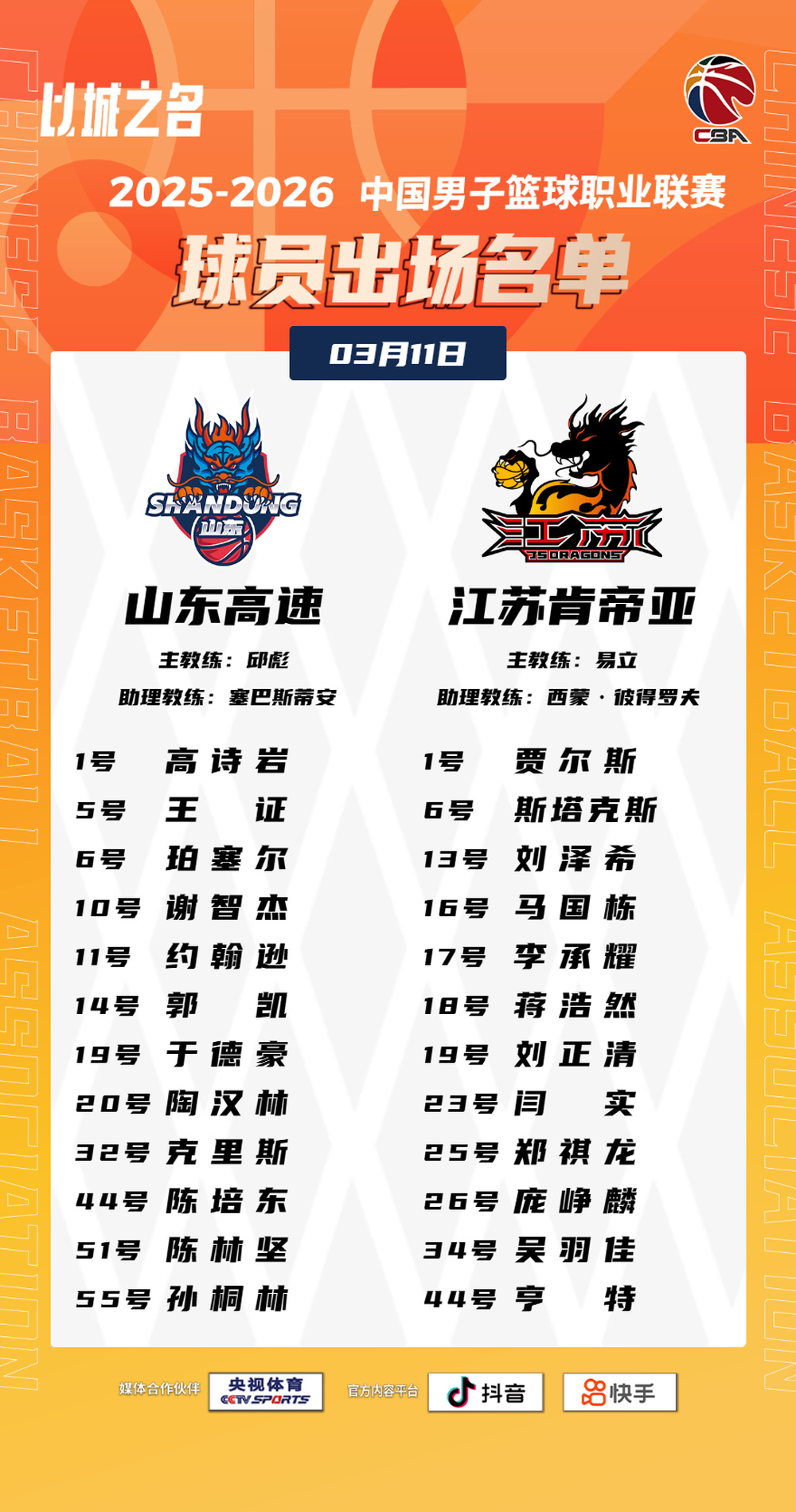 3月11日晚,山东高速男篮迎来CBA常规赛第二阶段的首场比赛,主场对阵江苏肯帝亚。赛前双方首发出炉:
