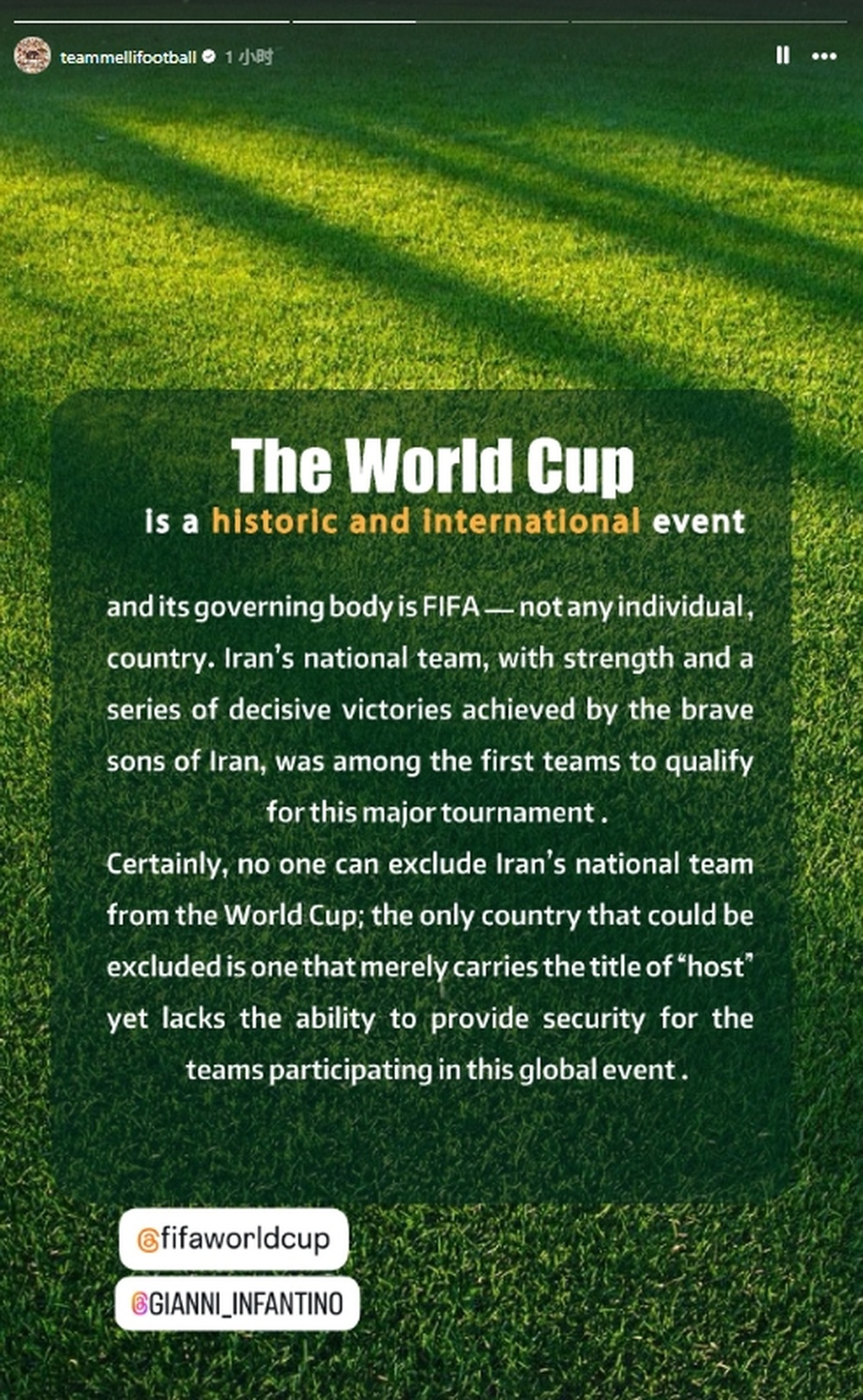 同时,伊朗男足将这则声明同时@给了国际足联世界杯的官方账号和国际足联主席因凡蒂诺的个人账号。