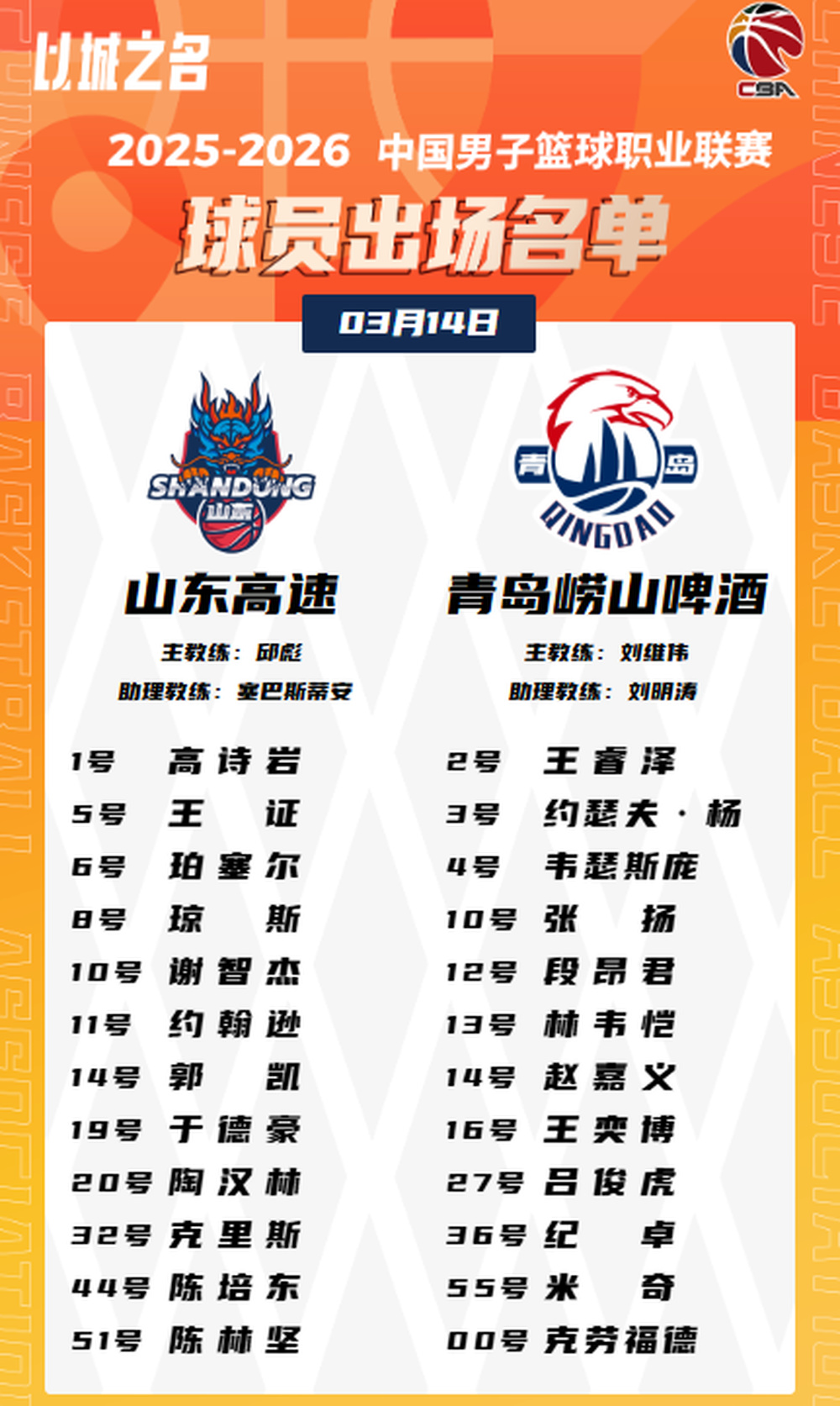 3月14日晚,山东高速男篮对阵青岛国信男篮的比赛即将开打,目前双方首发出炉。