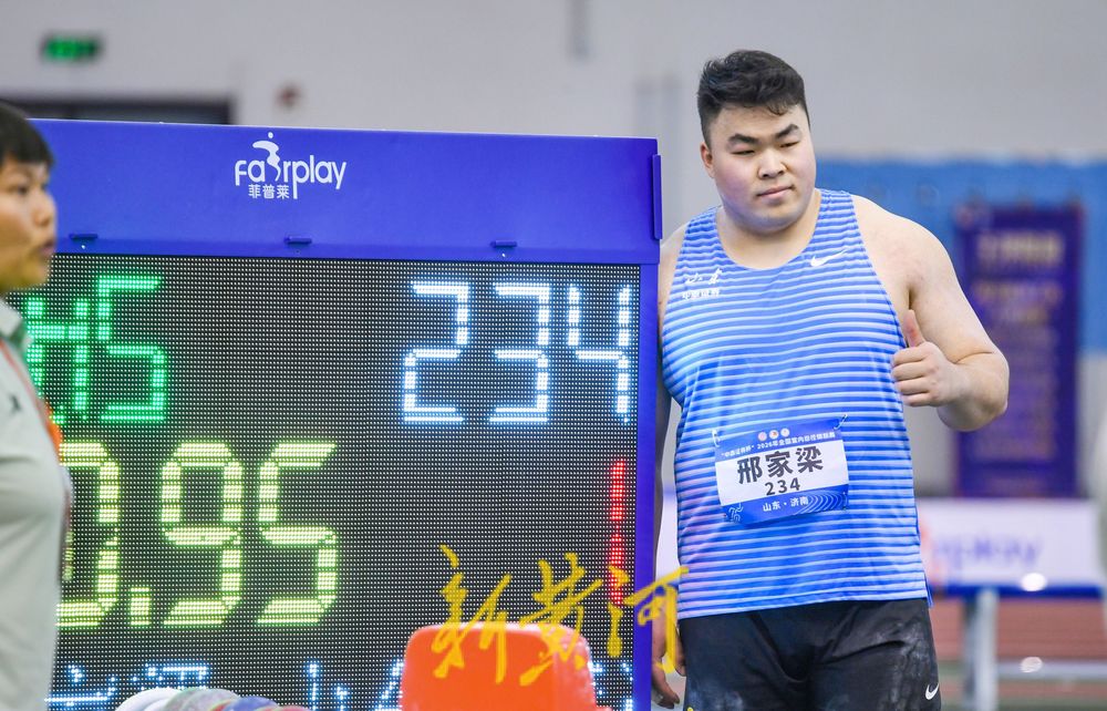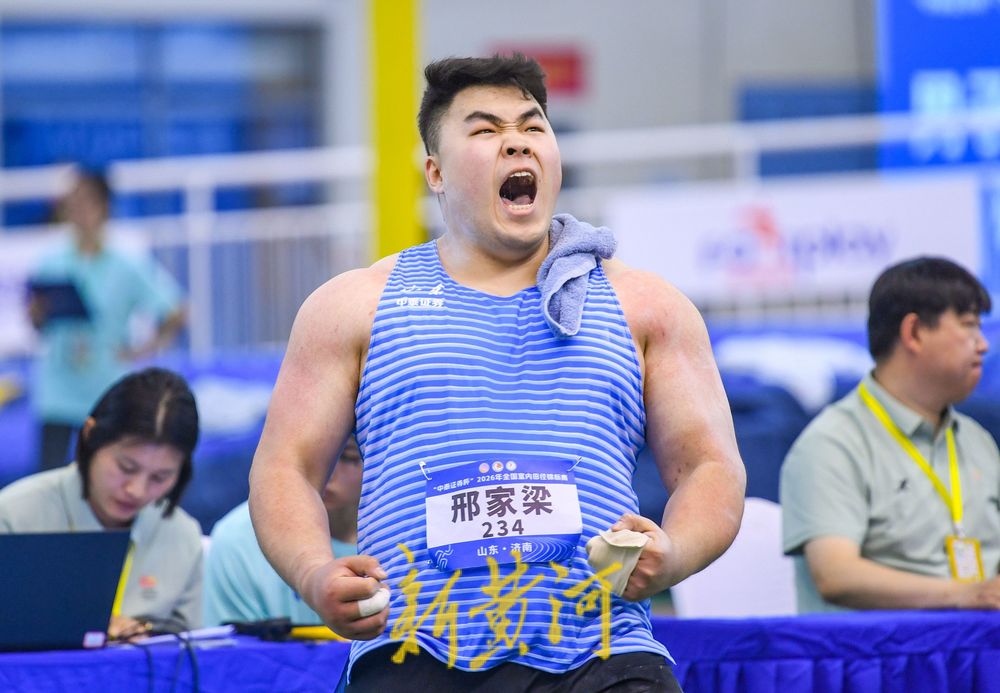 3月27日,在济南举行的2026年全国室内田径锦标赛男子铅球决赛中,山东选手邢家梁上演了令人震撼的“破纪录帽子戏法”。他三次打破由自己保持的全国纪录,最终以20.95米的惊人成绩夺得冠军。