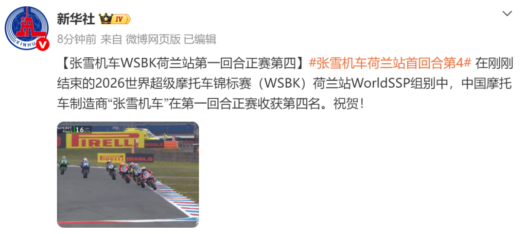 在刚刚结束的2026世界超级摩托车锦标赛(WSBK)荷兰站WorldSSP组别第一回合正赛中,中国摩托车制造商“张雪机车”获得第四名。在此前的葡萄牙站比赛中,该车队连续夺得两回合正赛冠军。