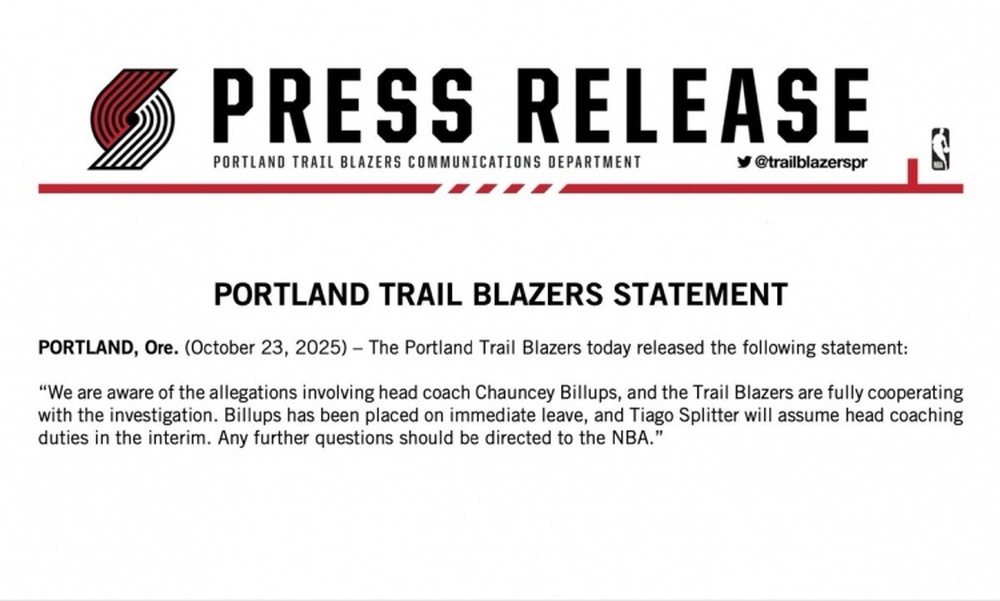 “我们已知晓有关主教练昌西-比卢普斯的指控,波特兰开拓者正全力配合调查,比卢普斯即日起暂停职务,临时主教练一职将由斯普利特暂代,所有后续进展将由NBA统一处理。”