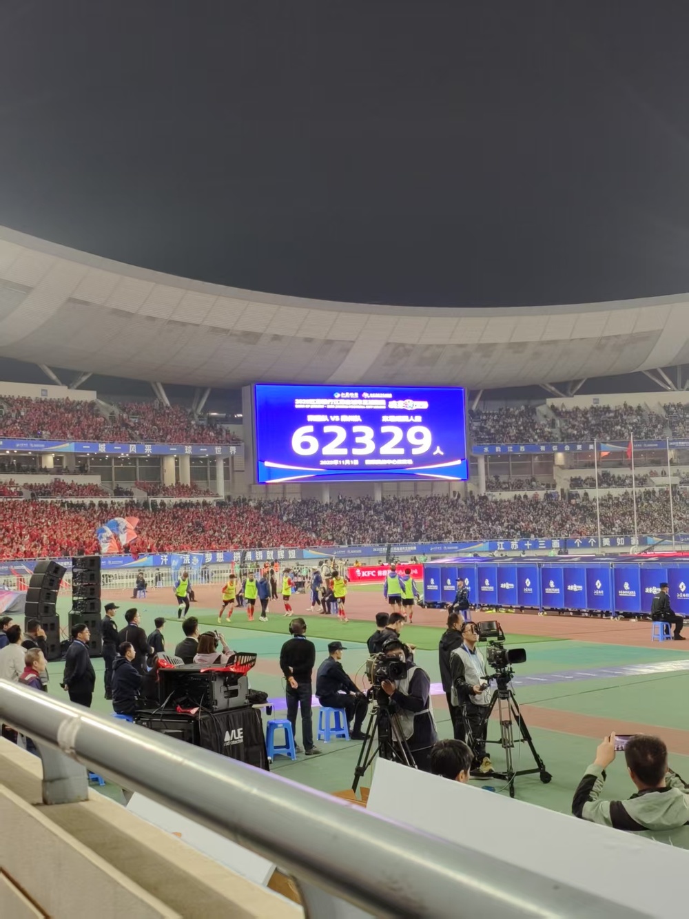 本场比赛的主裁判是著名国际级裁判马宁,他也是江苏籍。比赛正式开始前,苏超十三支球队一起亮相现场,“十三太保”球迷齐聚赛场,高唱战歌,口号声山呼海啸,将决赛氛围彻底拉满。现场播报信息显示,本场比赛总计62329人现场观战。这一数字,创造了苏超新的上座纪录,同时再次刷新全国业余足球赛事上座纪录。