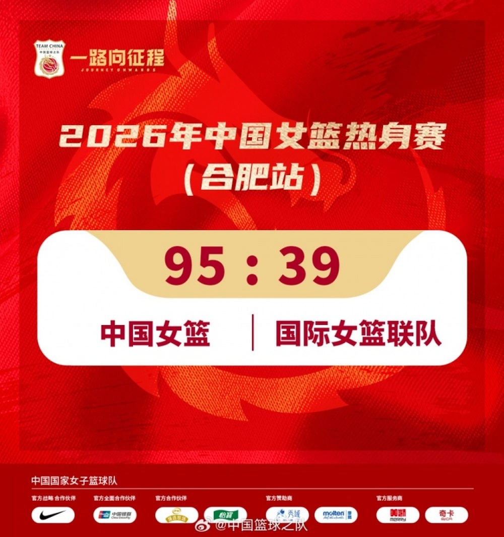 中国女篮以95:39战胜国际女篮联队。四节比分分别是(中国女篮在前):26-8、29-13、17-11、23-7。