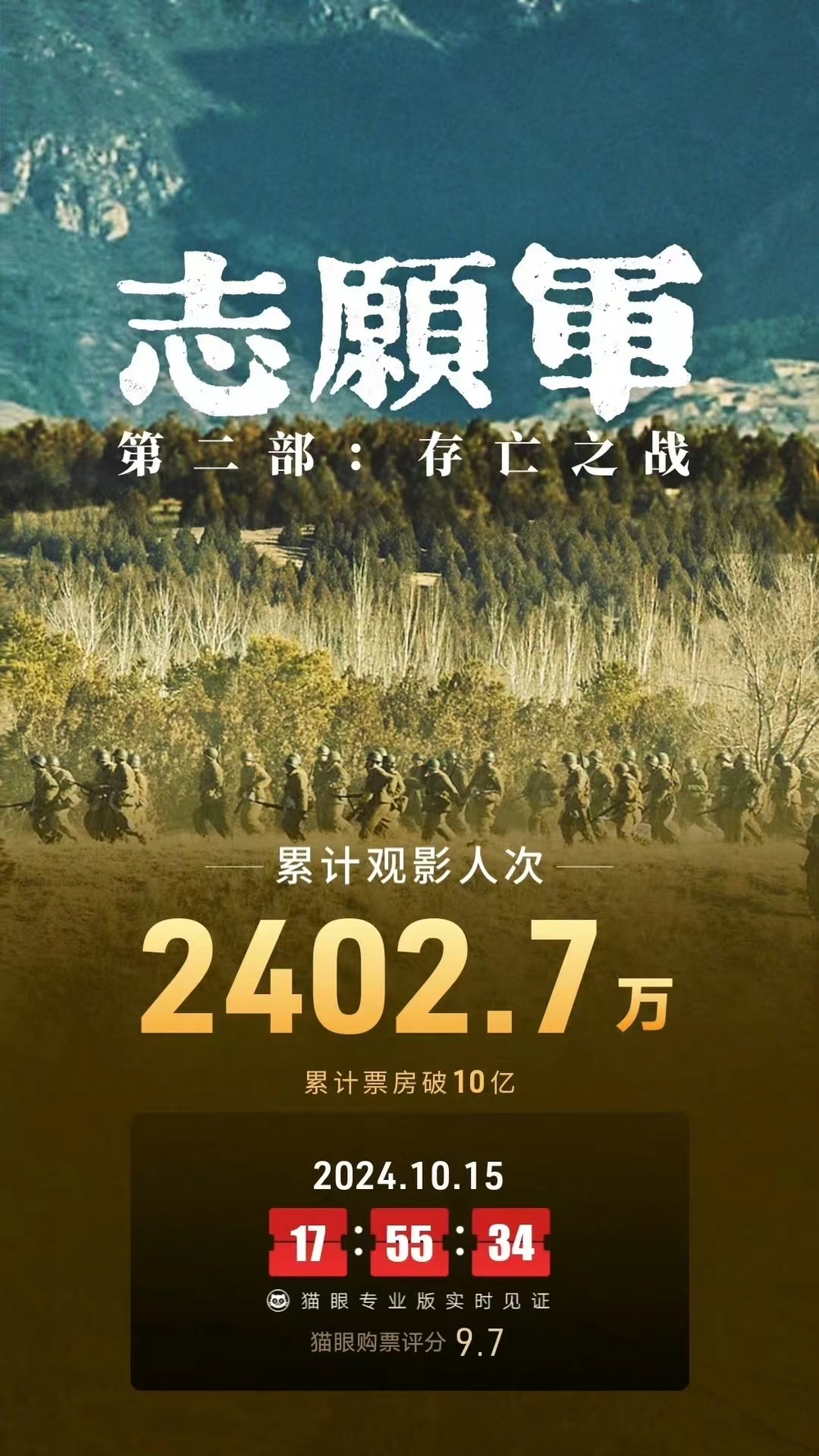 10月15日,据猫眼专业版数据,电影 《志愿军:存亡之战》上映16天 ,总票房破10亿。
