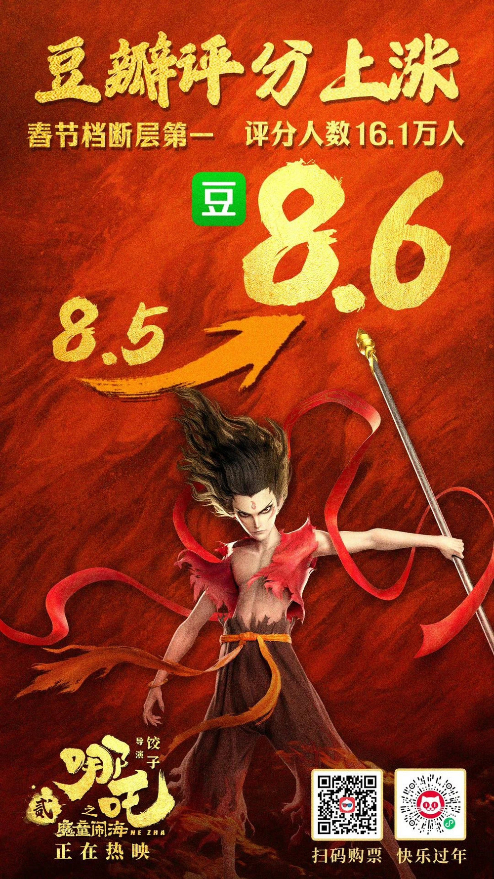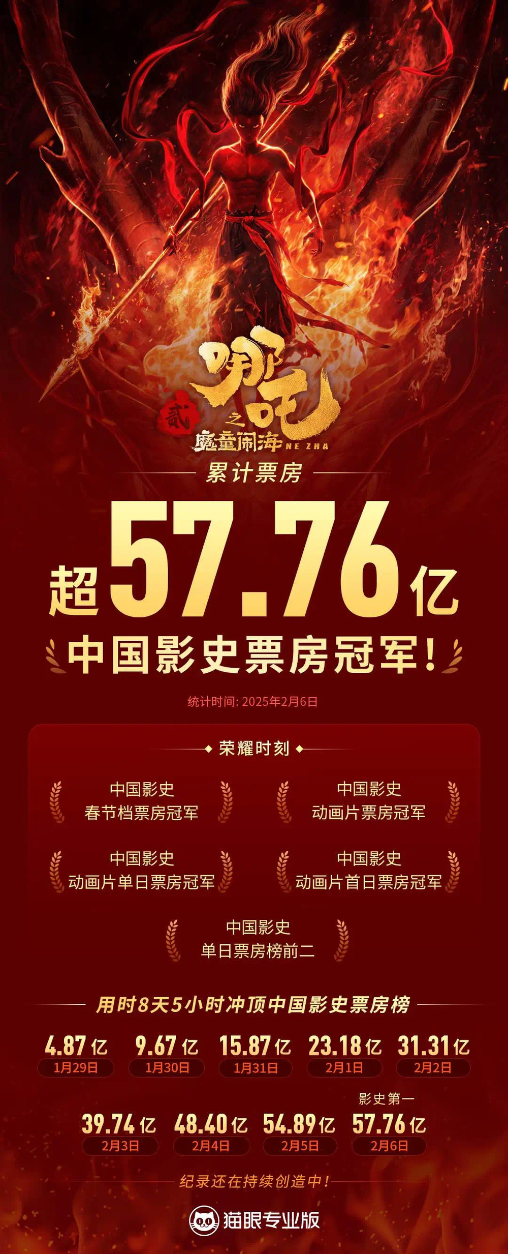 爆款现象级影片《哪吒之魔童闹海》(以下简称《哪吒2》)在档期内票房达48.39亿元,打破春节档票房冠军纪录。而档期结束,它的表现仍在“疯走”,2月6日,该片先后超过56.94亿元的《战狼2》和57.75亿元的《长津湖》登顶中国电影票房总榜冠军宝座,业内已经做出内地总票房冲击100亿元的最新预测。《哪吒2》在带来惊艳数字的背后,让今年春节档成为具有全民参与度的现象级春节档,更让大众看到国产电影工业的进步与电影市场的无限潜力,给全行业都带来极大的启发。