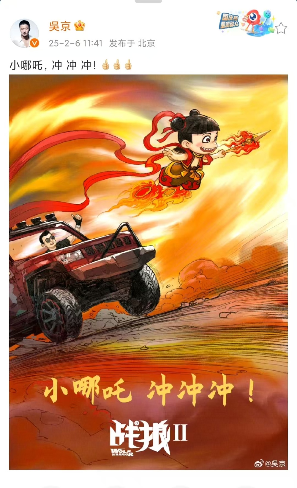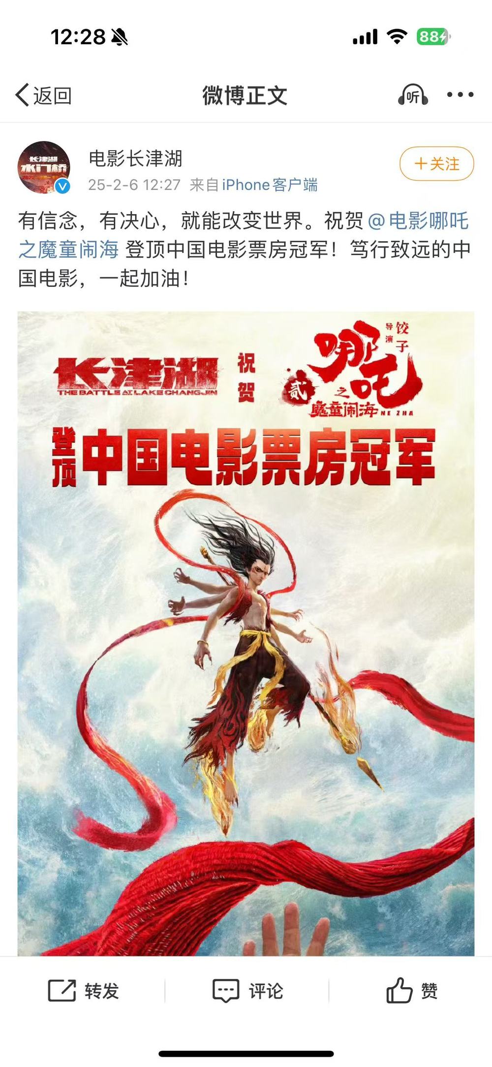 大年初三到初七连续5日逆跌,档期票房狂揽48.39亿元,迅猛的攻势帮助这部春节档白马影片只身拿下档期超五成票房,在档期内断层领先。2月6日,一骑绝尘的《哪吒2》毫无悬念地先后超过56.94亿元的《战狼2》和57.75亿元的《长津湖》,登顶中国电影票房总榜冠军宝座。《战狼》系列电影主演吴京发微博祝贺“小哪吒,冲冲冲!”并搭配《战狼2》电影祝贺海报。《长津湖》官微发文:“有信心,有决心,就能改变世界。祝贺@电影哪吒之魔童闹海登顶中国电影票房冠军!笃行致远的中国电影,一起加油!”