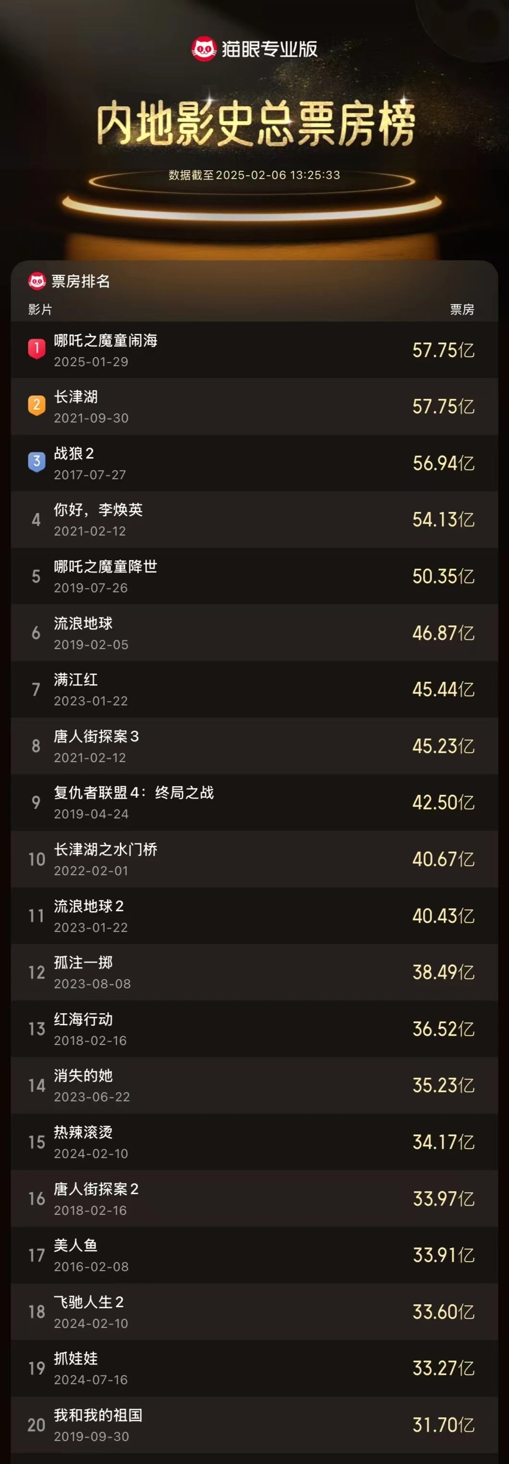 而《哪吒2》也用自身经验表明,观众永远都会给好电影买单。好电影好观众双向奔赴,优质内容驱动市场回暖。《哪吒2》个体的火热,这种远超预期的现象级表现,令业内和影迷感叹,原来中国电影市场票房的上限远远没有达到,曾经所谓的《战狼2》《长津湖》远远不是市场的终点,只待优秀的电影突破天际,让行业对上限和纪录有了全新的认知。