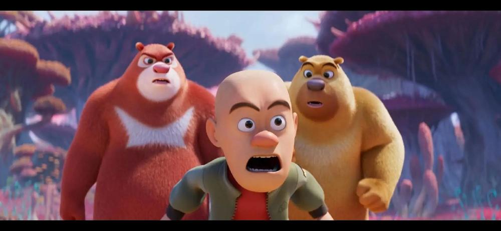 《熊出没·重启未来》的视觉呈现达到了该系列创作的新高度。在电影中,未来都市飘浮在空中,孢子植物遍布其中,重工业风格的建筑与奇特的自然景观交织在一起,末日废墟与未来前沿并存,形成极致的反差感。尤其是孢子世界的设计体现了“熊出没”系列奇观震撼力与动画趣味性兼备的风格——吞没一切的粉红色小颗粒可爱又可怕,这里有让人瞬间石化的“魔法”,有启动搞笑梦境的“幻术”,也有危险致命的陷阱。主创团队以天马行空的想象以及精湛的视效技术,表现富有科技感和奇幻色彩的画面,也提升了观众的观影体验。
