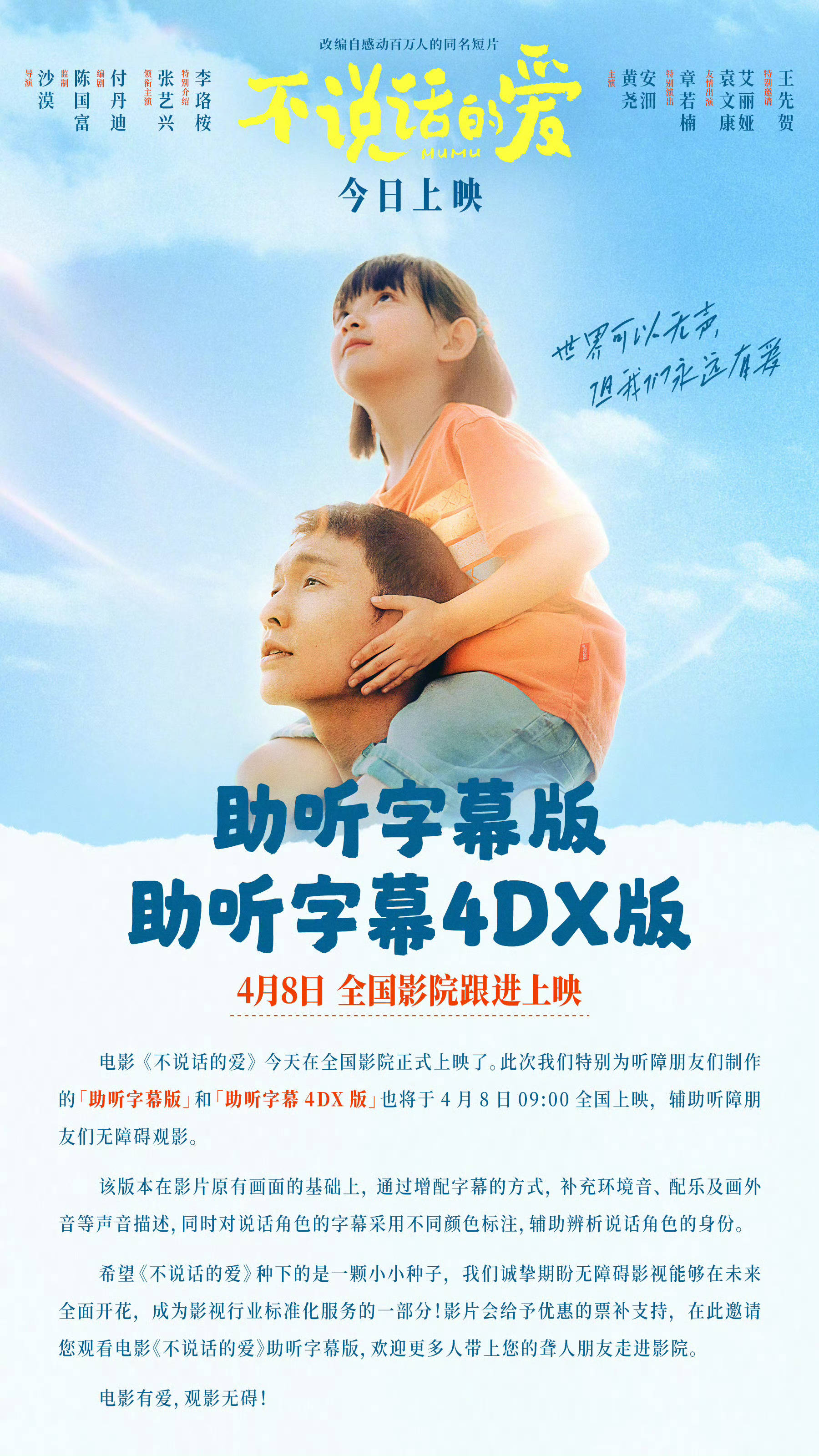 沙漠执导,张艺兴领衔主演听障题材亲情电影《不说话的爱》宣布为听障观众特别制作了“助听字幕版”和“助听字幕4DX版”,4月8日此版本已上映。