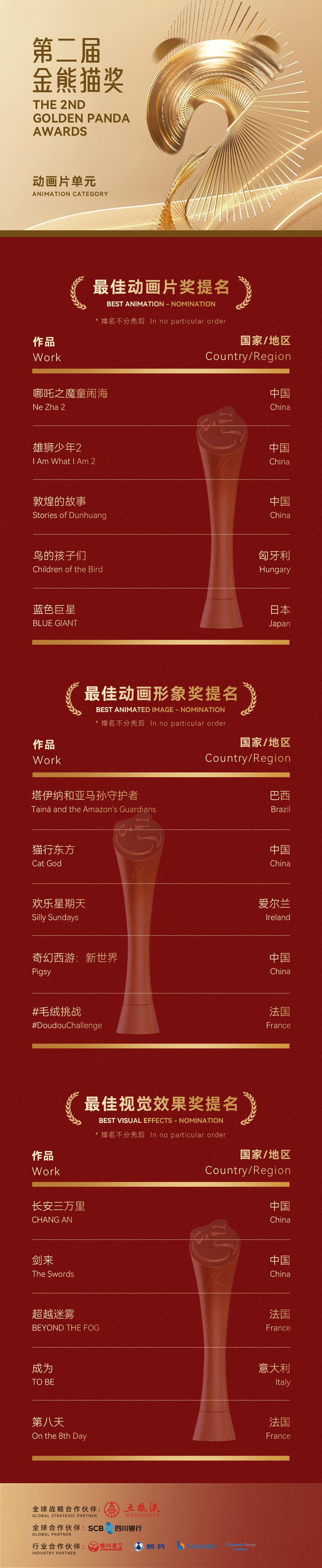 9月8日,由中国文联和四川省人民政府主办的第二届金熊猫奖提名名单正式发布。该奖项涵盖电影、电视剧、纪录片、动画片、评委会特别奖等多个单元,共征集到来自全球126个国家和地区的5343部作品参与角逐。《雪豹》《哪吒之魔童闹海》《繁花》《山花烂漫时》等作品上榜,宋佳、唐嫣、于和伟、朱一龙、蒋奇明等多位演员入围提名。